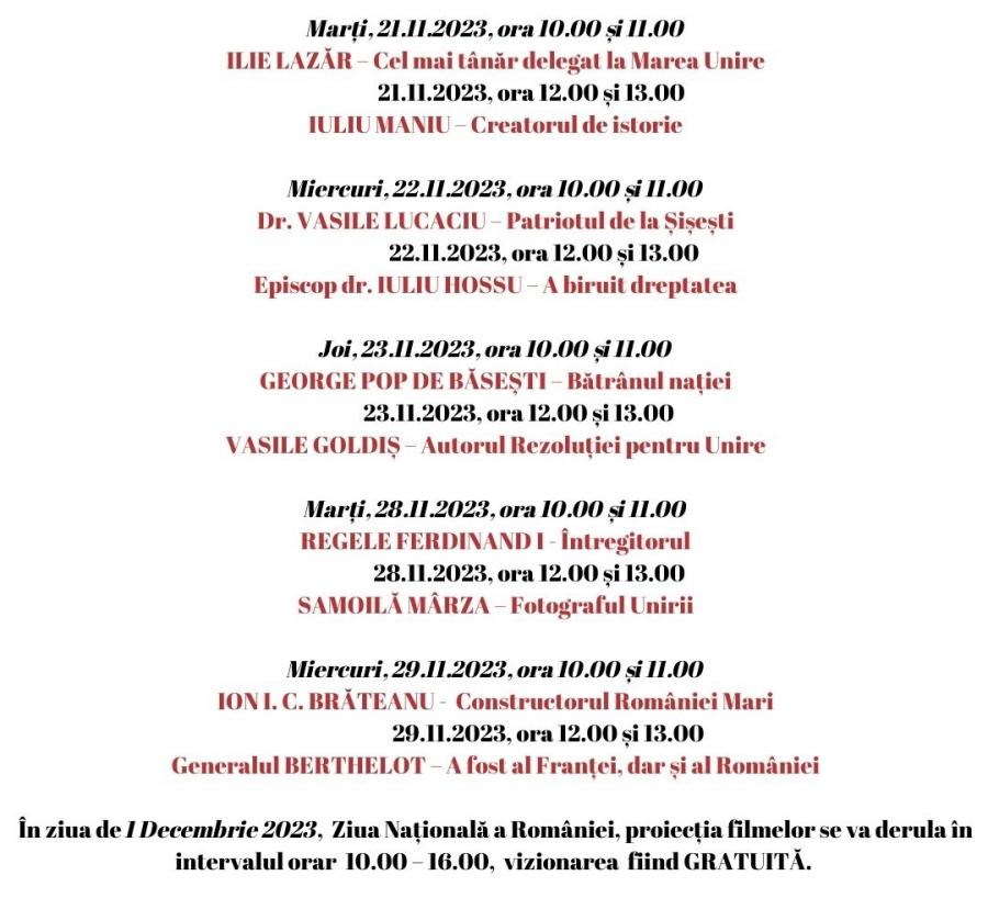 Muzeul Județean de Istorie și Arheologie Maramureș invită toți pasionații de istorie și nu numai la proiecția filmelor documentare „Oamenii care au făcut România Mare”, realizate de Lucia Hossu Longin sub genericul „Memorialul Durerii. O istorie care nu se învață la școală”.