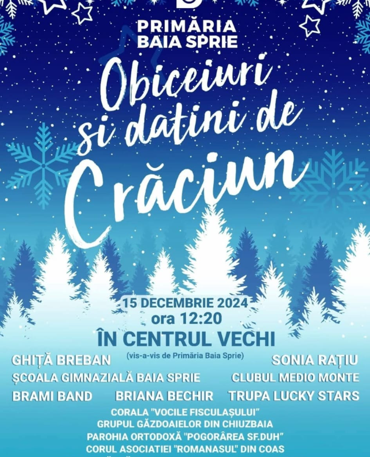 Duminică, 15 decembrie, ora 12.20, în parcul din Centrul Vechi al orașului Baia Sprie, vis-a-vis de Primărie, va avea loc evenimentul „Obiceiuri și datini de Crăciun”. Momentele muzicale vor fi susținute de: Ghiță Breban, Sonia Rațiu, Școala Gimnazială Baia Sprie, Clubul Medio Monte, Brami Band, Briana Bechir, Trupa Lucky Stars, alături de: