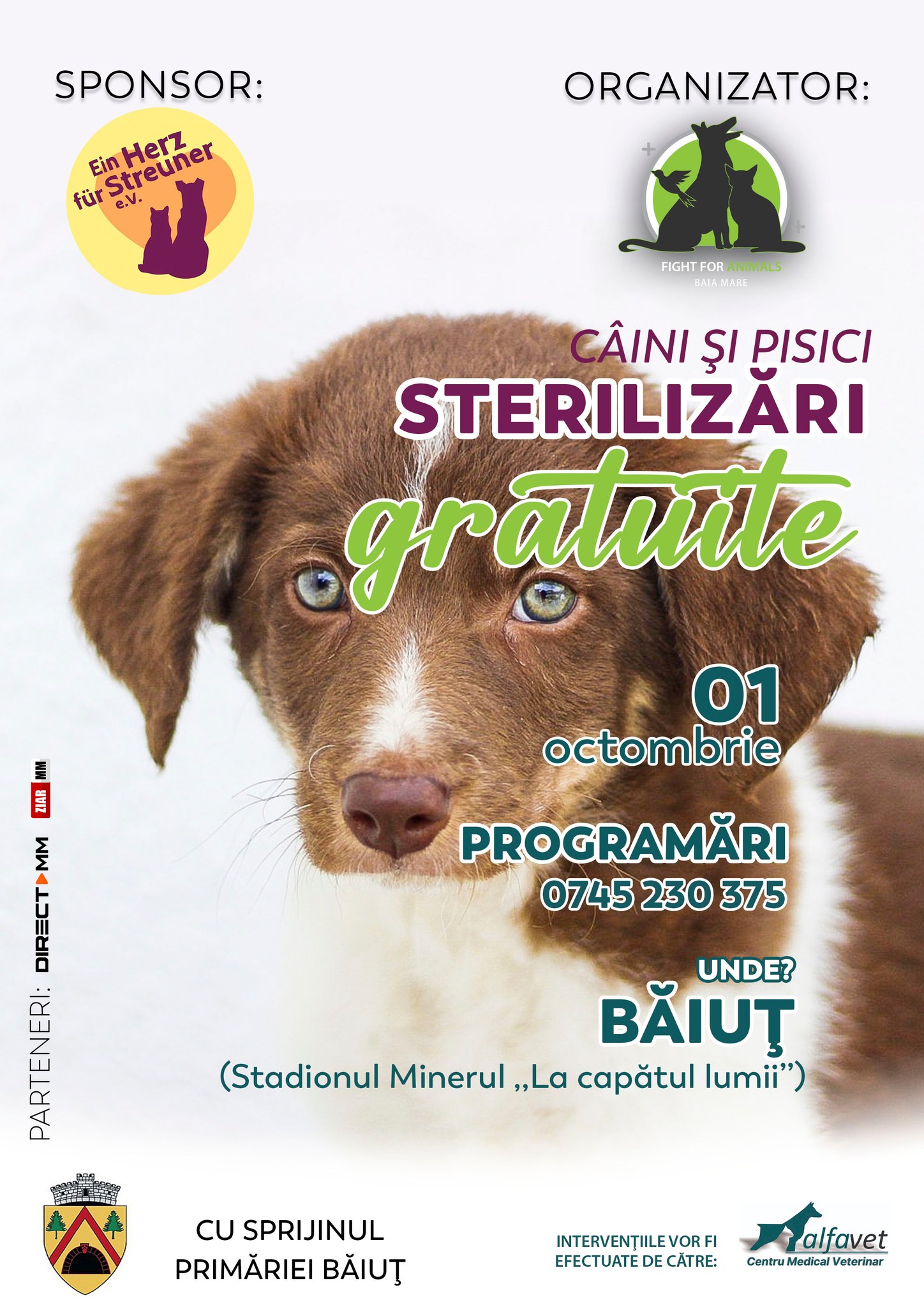 Va fi o mini-campanie în regim de programare cu locuri limitate! Deci profitați! Locație: Stadionul Minerul Baiut („La capătul lumii”). Este foarte important să nu hrăniți animalele cu 12 ore înainte de intervenție. Sponsorul principal al acestei actiuni este asociatia Ein Herz für Streuner e.V. Mulțumim pentru sprijinul acordat primăriei comunei Băiuț și doamnei primar Maciuc Viorica. Interventiile vor fi efectuate de Alfavet – Cabinet Veterinar Baia Mare”, arată Paul Oșan, președintele Asociației Fight For Animals Baia Mare. DirectMM.ro este din nou alături de acești tineri activi care vor să ajute prietenii blănoși, ca atare este iarăși partenerul media principal. Cu toate că este un subiect sensibil, specialiștii în domeniu recomandă sterilizarea micilor prieteni pentru a evita atât vagabondajul, care determină un număr mare de pui care pot ajunge pe străzi, cât mai ales pentru a evita unele probleme de sănătate generate din această cauză și care pot fi periculoase pentru cei care ne fac mai fericite zilele, medicii veterinari explicând chiar că sterilizarea le prelungește viața companionilor noștri.
