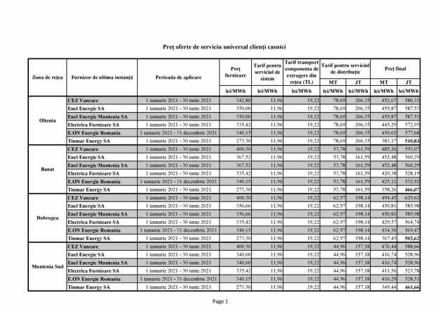 Lista preţuri oferte de serviciu universal clienţi casnici:
