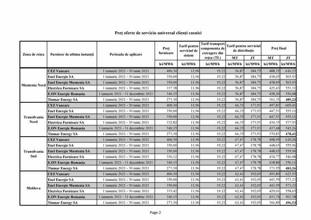 Conform datelor publicate de ANRE, cei şase furnizori de ultimă instanţă (FUI) care vor oferi populaţiei servicii de furnizare a energiei electrice în piaţa universală (adică pentru consumatorii casnici care nu îşi schimbă nici furnizorul şi nici contractul de pe piaţa reglementată pe piaţa liberă) vor plăti pentru fiecare 1.000 de kwh preţuri cuprinse între 349 de lei (cu toate tarifele incluse) şi 498 de lei.