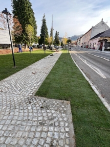 Mai exact, se montează rulouri de gazon, iar în combinație cu aleile de piatră arată foarte bine.
