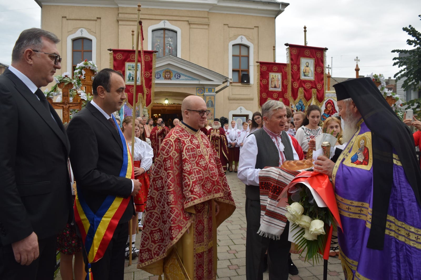 Înaltpreasfințitul Părinte Andrei a fost întâmpinat, conform tradiției, cu pâine, sare și flori, de un grup de copii și tineri îmbrăcați în straie tradiționale, alături de soborul de clerici și oficialitățile locale.