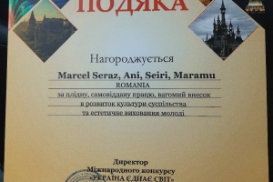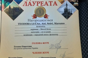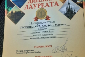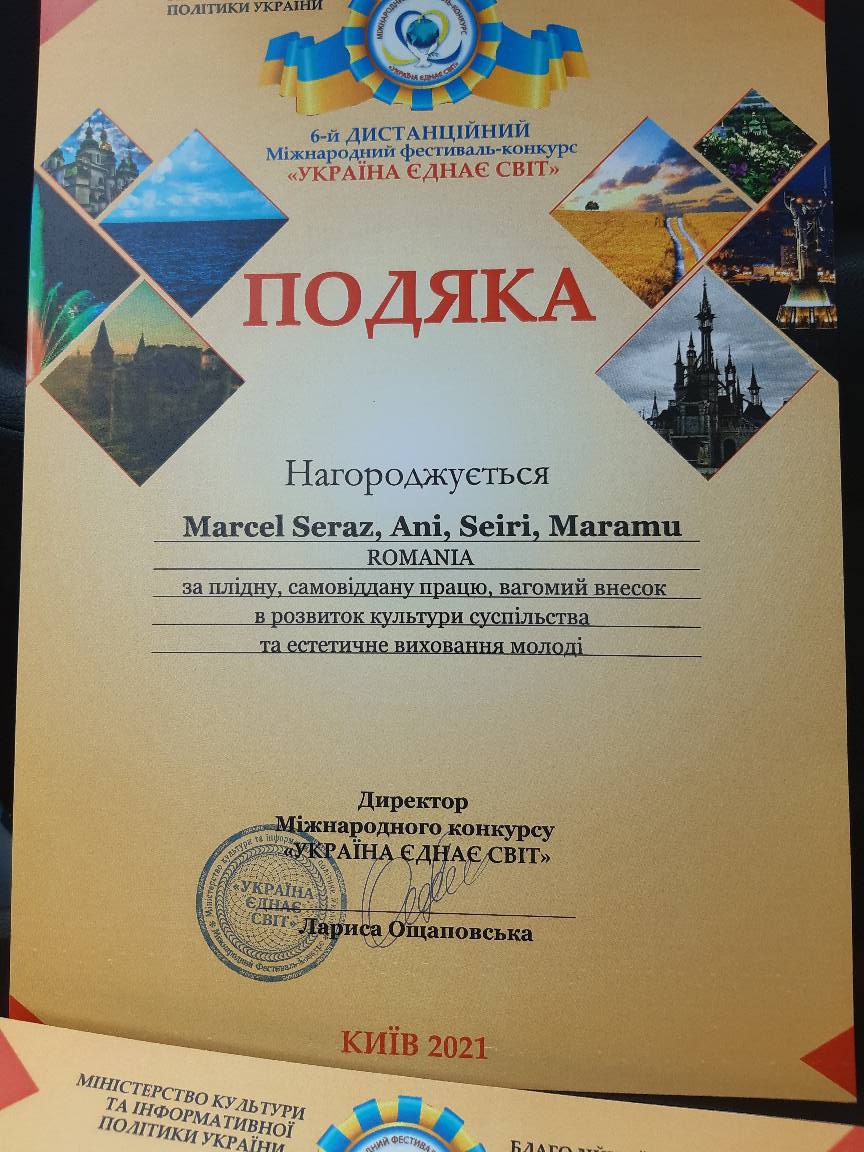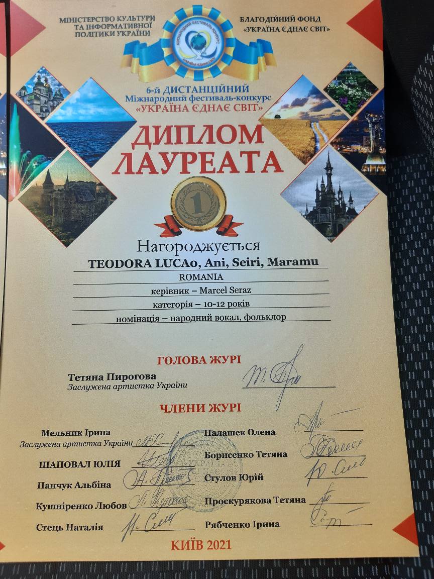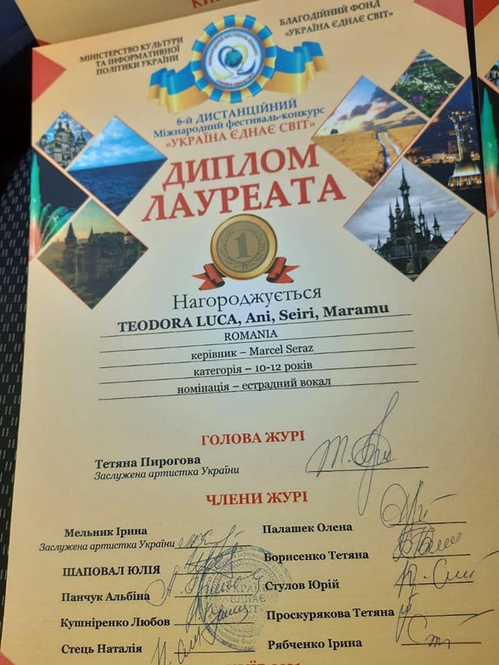 „La puternicul concurs „Ucraina unește lumea”, ediția a VI-a, desfășurat la Kiev, unde am fost in competiție cu copii din peste 30 de țări, am primit aprecierile juriului și două premii întâi! Cântecele „Tăticul meu e la război” și „Io-s fată din Bistrița” au fost foarte apreciate de juriu! Mulțumesc pentru pregatire domnului profesor Marcel Seraz și juriului pentru aprecierile mele!”, a arătat Teodora Dănțăușa.