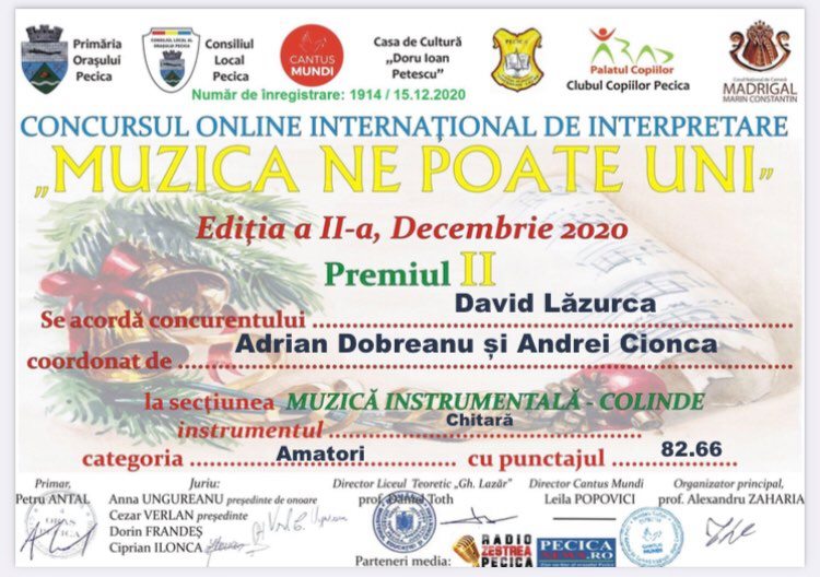 - David Lăzurca (18 ani) / Premiul II / Secțiunea Muzică Instrumentală Colinde – Chitară / 82,66 punctaj / coordonatori Adrian Dobreanu și Andrei Cionca.