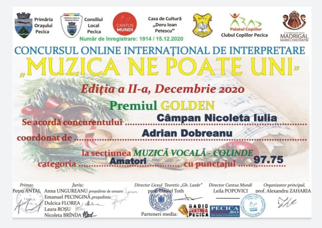 - Nicoleta Iulia Câmpan (19 ani) / Premiul Golden (I) / Secțiunea Muzică Vocală Colinde / 97,75 punctaj / coordonator Adrian Dobreanu;