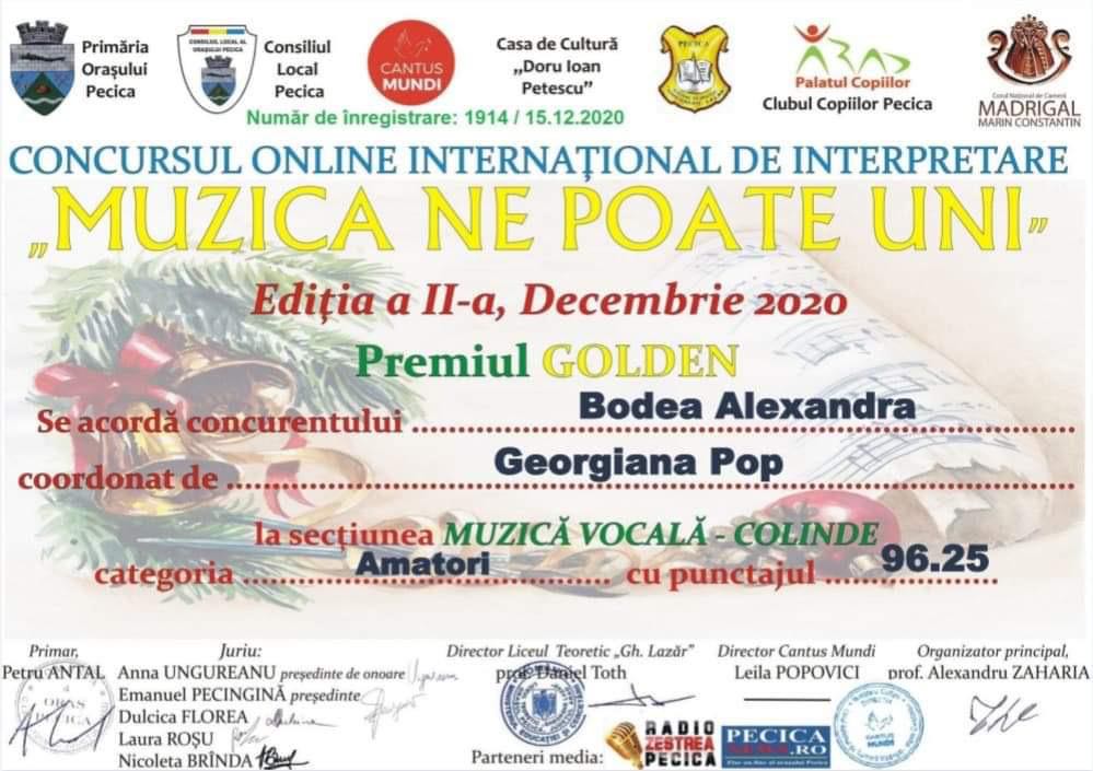 - Alexandra Bodea (17 ani) / Premiul Golden (I) / Secțiunea Muzică Vocală Colinde / 96,25 punctaj / coordonator Georgiana Pop;