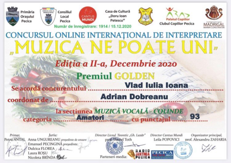 - Iulia Ioana Vlad (13 ani) / Premiul Golden (I) / Secțiunea Muzică Vocală Colinde / 93 punctaj / coordonator Adrian Dobreanu;