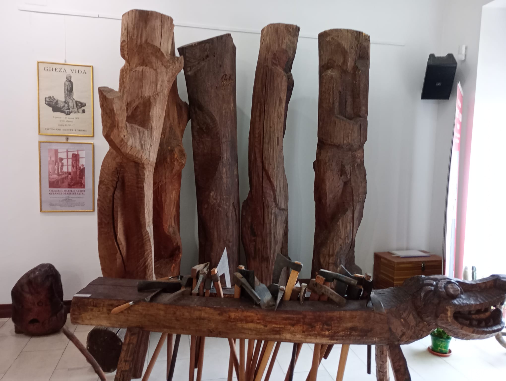 VERA VANCEA: Ne aflăm în atelierul memorial Veda Gheza, care reprezintă donația familiei pentru municipalitate. Lucrările au fost aduse din casa lui, de aceea putem remarca această atmosferă de lucru. Ele sunt în diverse stadii, neterminate și la care a renunțat temporar. Avem și uneltele de lucru, și bancul.