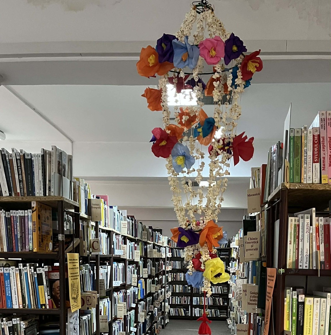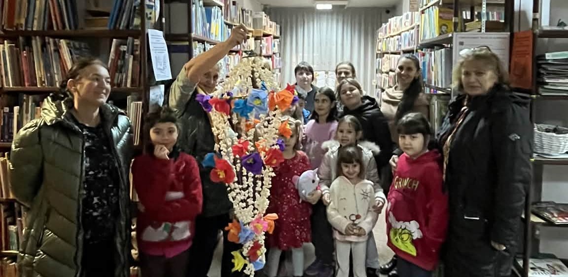 A fost un atelier aparte la Filiala Traian a Bibliotecii Județene, unul de împodobit un brad cu ghirlande din popcorn și ornamente din hârtie creponată, fără decorațiuni moderne.