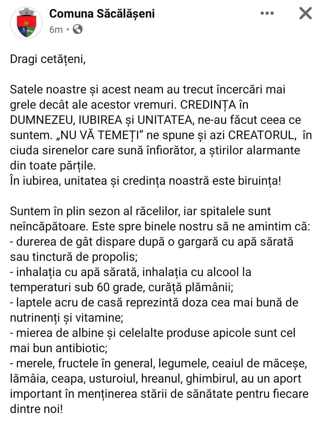 Așadar că tot ați fost curioși, „este spre binele nostru să ne amintim că: durerea de gât dispare după o gargară cu apă sărată sau tinctură de propolis; inhalația cu apă sărată, inhalația cu alcool la temperaturi sub 60 grade, curăță plămânii”, ne explică reprezentanții Primăriei Săcălășeni.