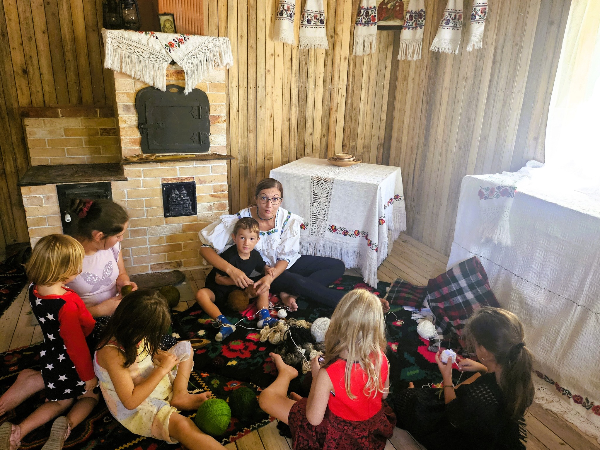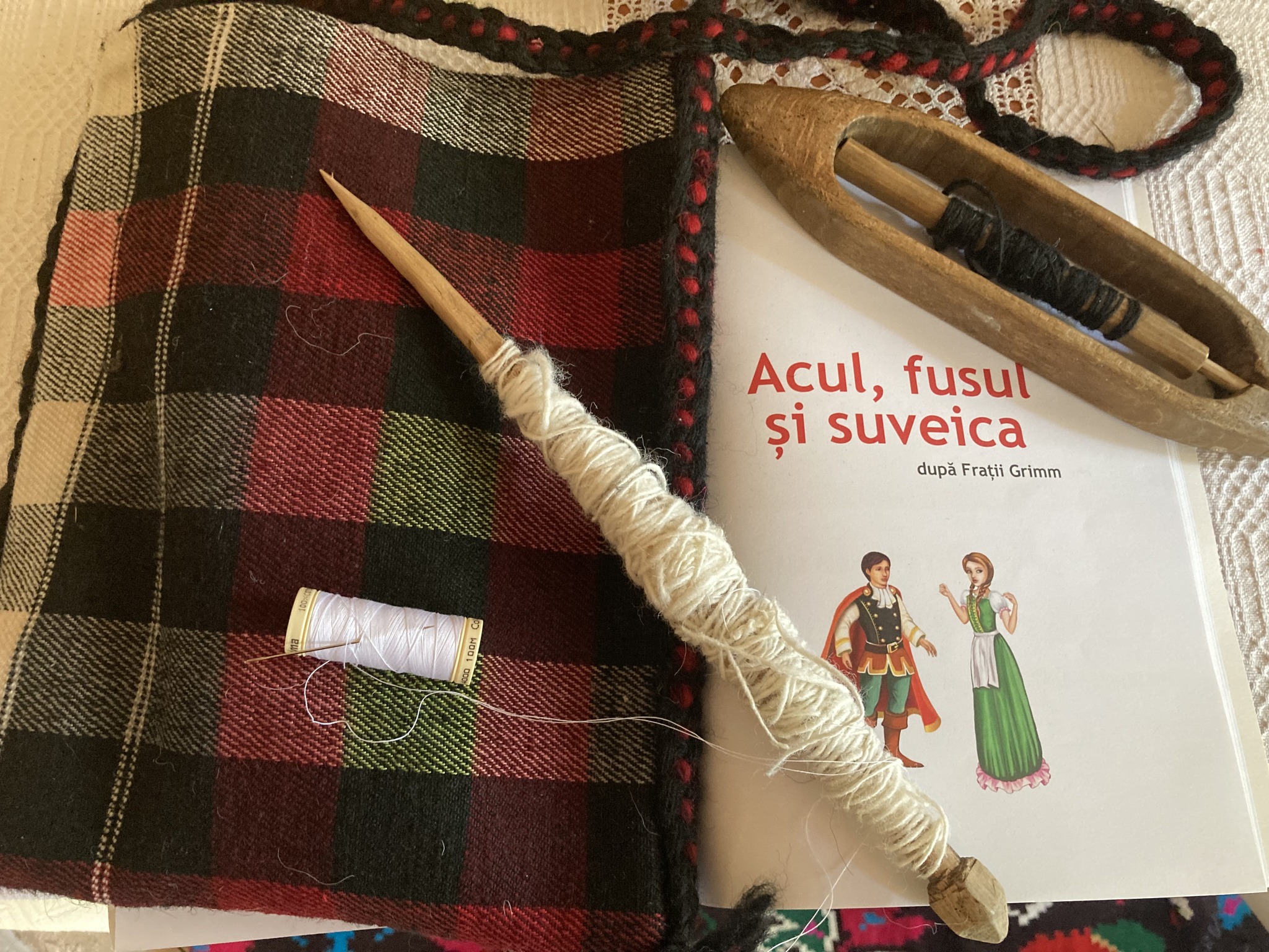 Pentru o experiență complexă de învățare, am ales nu doar să citim povestea, ci să o simțim (se știe că cei mici asimilează mai bine informația atunci când e însoțită de trăire). Astfel, am adus, din Maramureș, chiar uneltele din poveste – acul, fusul și suveica – le-am explicat cum se folosesc și cărui meșteșug le sunt caracteristice. Am descoperit apoi, în căsuță, obiecte de decor despre care am citit în poveste și am ”ghicit” de care dintre cele trei unelte a fost nevoie la realizarea lor.
