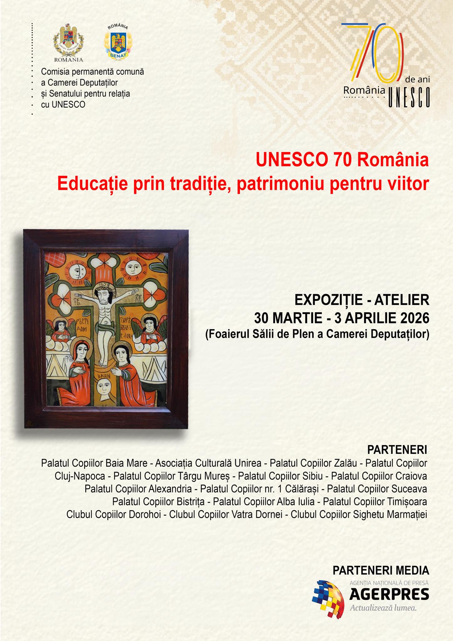 Luni, 30 martie, în Foaierul Sălii de Plen a Camerei Deputaților a avut loc loc vernisajul expoziției „UNESCO 70 România – Educație prin tradiție, patrimoniu pentru viitor”.
