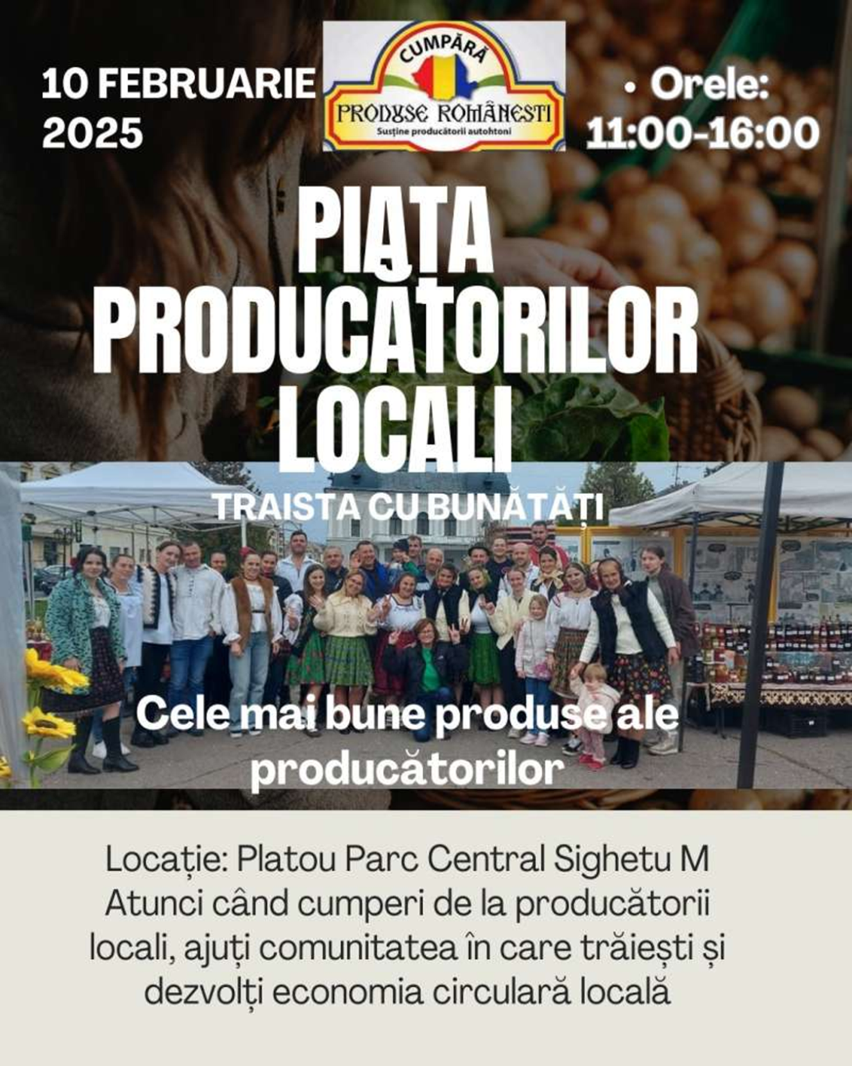 Luni, 10 februarie, locuitorii și vizitatorii din Sighetu Marmației sunt invitați să descopere gustul autentic al produselor locale la ediția din acest an a pieței „Traista cu bunătăți”. Evenimentul se va desfășura între orele 11:00 și 16:00, în Parcul Central al municipiului, reunind producători din întreaga zonă.