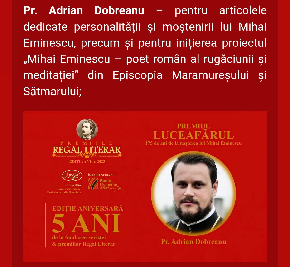 Premiile Regal Literar 2025: Părintele Adrian Dobreanu a fost distins cu Premiul „Luceafărul”