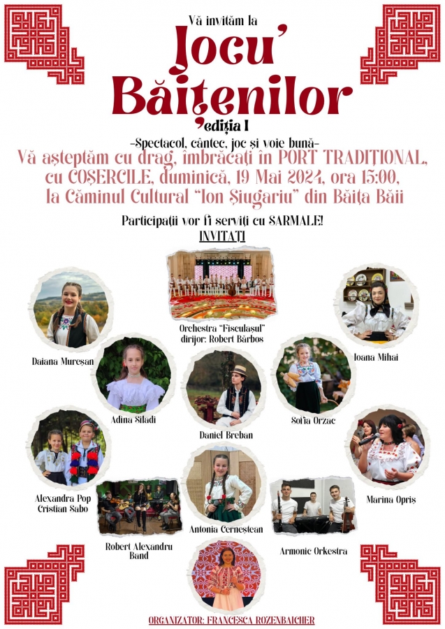 „Vă așteptăm cu drag, îmbrăcați în port tradițional, cu coșercile. Participanții vor fi serviți cu sarmale”, anunță tânăra Francesca Rozenbaicher, organizatoarea manifestării.