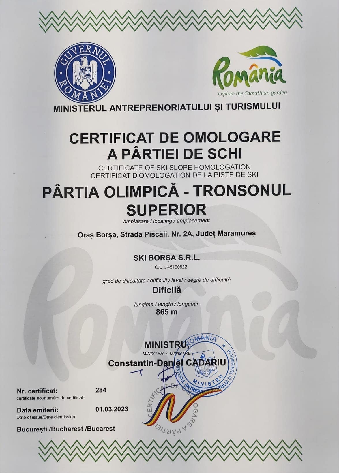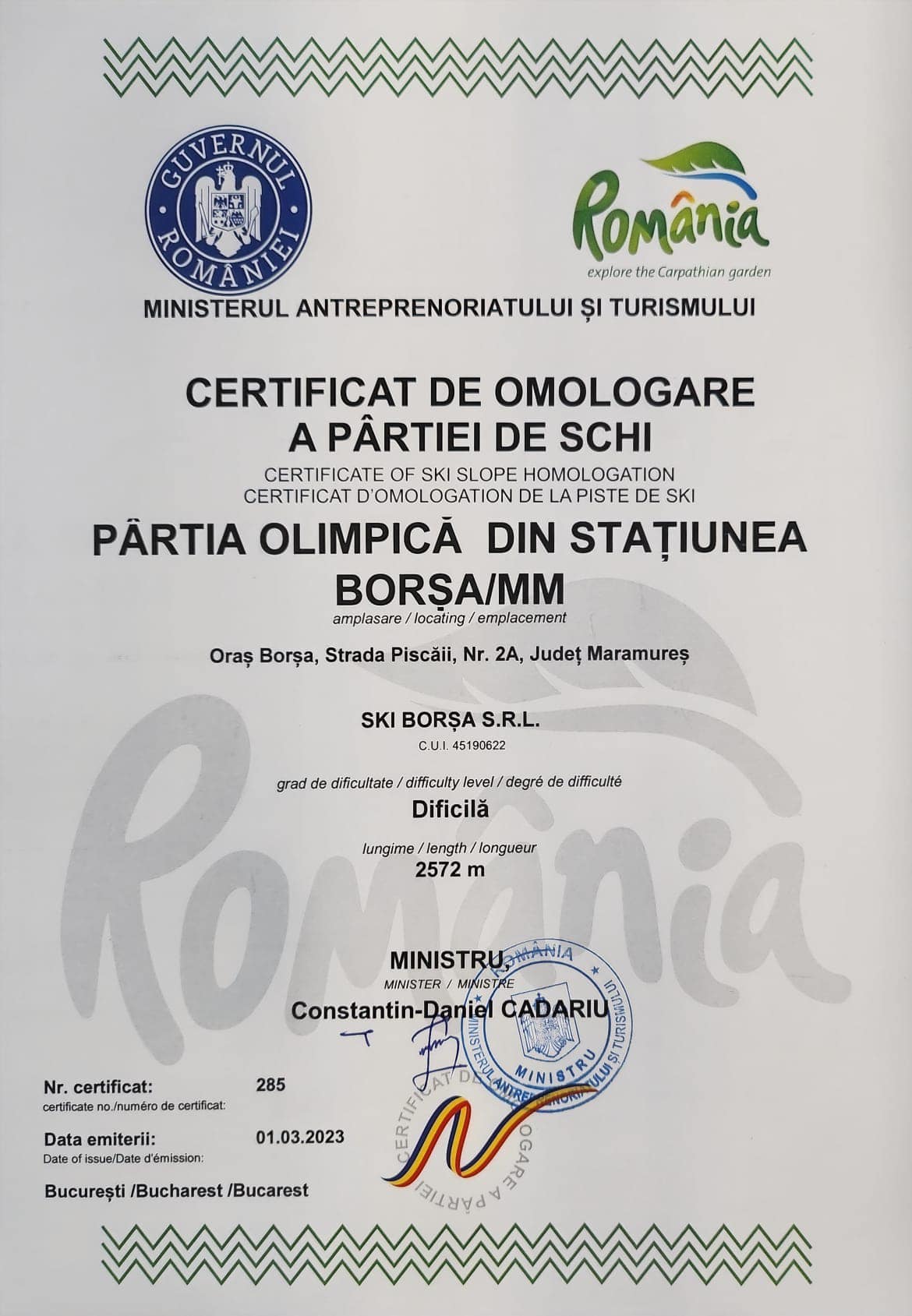 Primul certificat este unul care atestă omologarea unui tronson din pârtia olimpică de schi, care are lungimea de 2572 metri și este încadrată ca având un grad ridicat de dificultate, iar al doilea certificat atestă omologarea tronsonului superior al pârtiei de schi olimpice, de asemenea cu grad ridicat de dificultate, care are lungimea de 865 metri. Trebuie să arătăm că Telegondola de la Borșa are 2,6 km, cu o capacitate de 1.800 persoane/oră, iar pârtiile din această stațiune au o capacitate de 5000-7.000 de schiori. Telegondola leagă complexul turistic de vechea pârtie olimpică de schi. Ar trebui arătat că, în total, pârtia atestată în prezent are 3 km lungime, și este prima pârtie de ski olimpică din România.