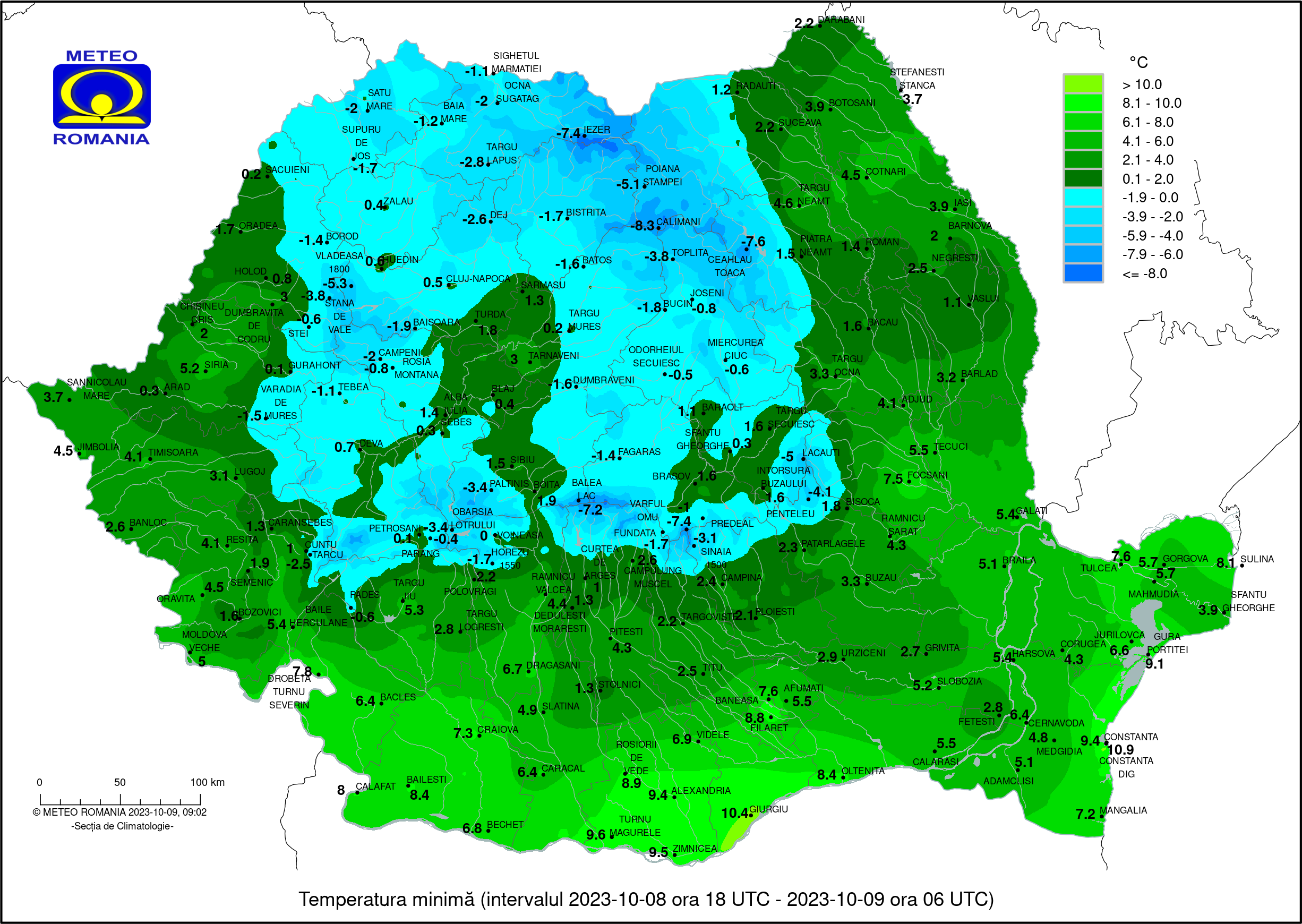 În dimineața de 7 octombrie, am avut -1 grade Celsius la stația meteo Iezer și valori pozitive în rest. În noaptea de 7 spre 8 octombrie, am avut mai mult valori pozitive și doar local către sau sub pragul de îngheț. În dimineața de 9 octombrie, în Baia Mare, am avut, preț de puțin timp, înainte de răsărit, în jurul orei 7 dimineața, sub 0 grade, mai precis valoarea de -1,2 grade. În județ am avut valorile următoare: la Sighetu Marmației, -1,1 grade, în timp ce la Cavnic și Ocna Șugatag, am avut -2 grade, iar la Târgu Lăpuș am avut chiar -2,8 grade, respectiv în Borșa și Pasul Prislop, -3 grade și -4 grade. La stația meteo Iezer, în jurul orelor 3-4, s-au înregistrat chiar -7,4 grade Celsius, în noaptea de 8 spre 9 octombrie. Acesta este recordul momentan al toamnei acesteia în Maramureș. Cu toate acestea, vorbim despre valori normale pentru luna octombrie.