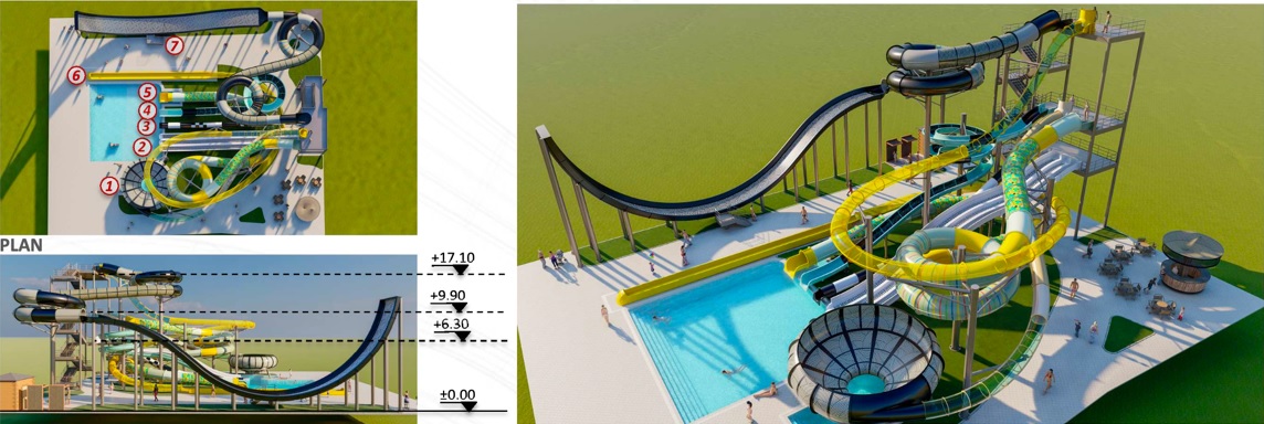 - Zona acoperită va cuprinde corpul principal ”Aquapark” și construcții adiacente exterioare (recepție, grupuri sanitare, spații comerciale) având o suprafață construită totală de 9.425 metri pătrați.