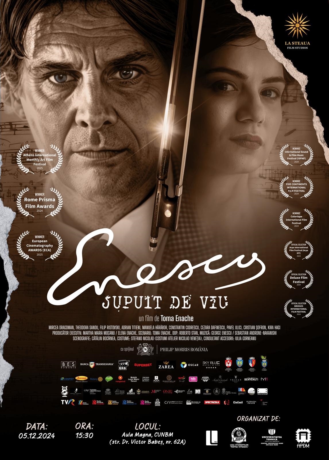 „ENESCU, jupuit de viu” este capodopera propusă de Toma Enache, unul dintre cei mai activi și apreciați regizori români, premiat pe cele mai importante scene internaționale. Noua creație, primul film românesc despre viața lui George Enescu, este adusă în Baia Mare, în premieră, de un grup de inițiativă din mediul academic băimărean, aducând o reală oportunitate studenților, dar și pasionaților de artă și cultură.