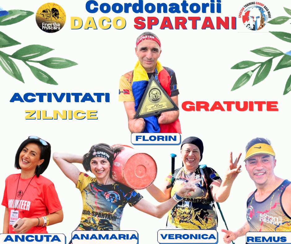 Super Omul Fără Antebrațe FLORIN ZAHARIE (Campion Mondial Spartan Para 2025 America, Ambasador Daco Spartanii) ANAMARIA POPA (Pompierii ISU, Antrenor Fitness, Ambasador Daco Spartanii), ANCUȚA MUNTEAN (Profesoară la Palatul Copiilor BM, 3x Ambasador Spartan România, Ambasador Daco Spartanii) VERONICA DRAGOMIR (Pensionată / Poliția Locală BM, Ambasador Daco Spartanii) și REMUS DIACONU (Fondator Asociatia Energia Mișcării / Coordonator/Antrenor Daco Spartanii/ STG BM / STG Kids BM, Spartan Kids România).