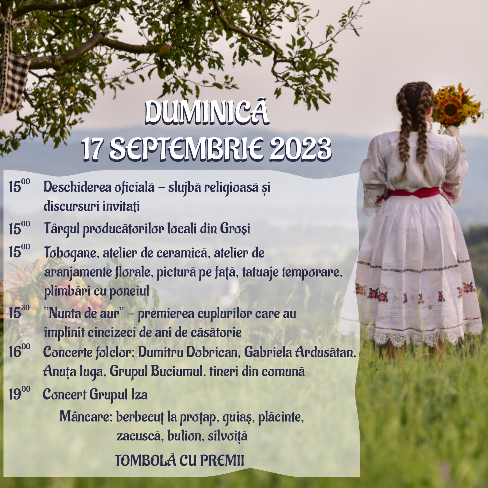 În perioada 16-17 septembrie, la Groși va avea loc cea de-a a IV-a ediție a evenimentului „Sărbătoarea toamnei”. Acesta se va desfășura pe pășunea de la intrarea în localitate.