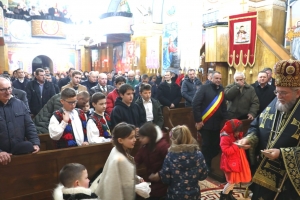 În timpul Sfintei Liturghii, Preasfinţitul Părinte Episcop Iustin s-a rugat în genunchi cu tot poporul din biserică pentru încetarea războiului din Ucraina, pentru linişte şi pace în lume.