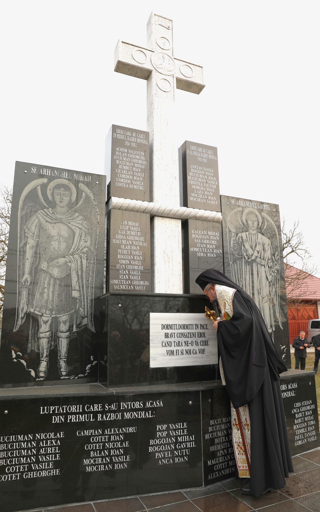 Întâmpinarea Ierarhului a fost făcută în faţa Monumentului Eroilor, situat în curtea bisericii, cu marea mulţime de credincioşi, de jur împrejur, deoarece urma să se petreacă binecuvântarea acestuia de Preasfinţitul Părinte Iustin. Lumea a fost emoţionată, pentru că aproape în fiecare familie din sat există o rudă care nu s-a mai întors din cele două războie mondiale. În amintirea lor a fost ridicat acest monument de primărie, la iniţiativa actualului primar şi a altor locuitori din sat.