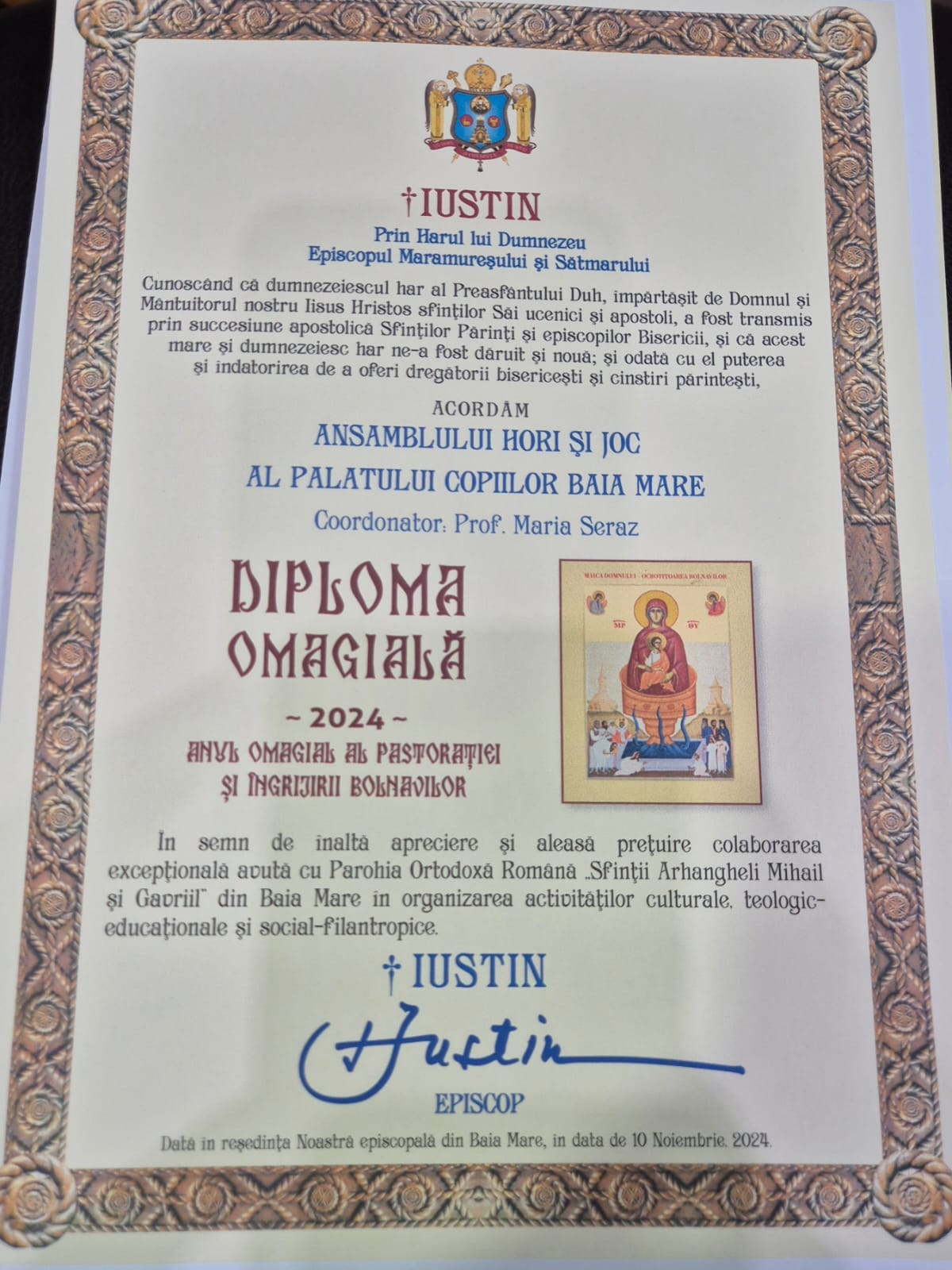 PS Părinte Iustin a acordat Ansamblului „Hori și Joc” Diploma Omagială pentru colaborarea avută cu Parohia „Sfinții Arhangheli Mihail și Gavriil” din Baia Mare