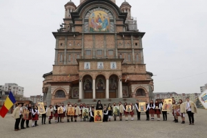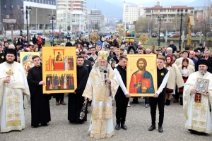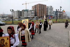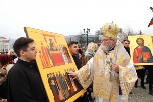 Credincioşii au pornit, la sfârşitul Sfintei Liturghii, într-o procesiune în jurul Catedralei, cu icoane în mâini, împreună cu întreg soborul slujitor din această duminică importantă pentru dreapta credinţă. Procesiunea s-a încheiat pe esplanada Catedralei Episcopale „Sfânta Treime”, unde au fost rostite câteva ectenii şi otpustul, adică formula de încheiere a Sfintei Liturghii. Deşi pe un frig de 1-2 grade C, mulţimea credincioşilor a cinstit aşa cum se cuvine Duminica Ortodoxiei, prin venerarea sfinţilor de pe icoanele pe care le purtau în mâinile lor.
