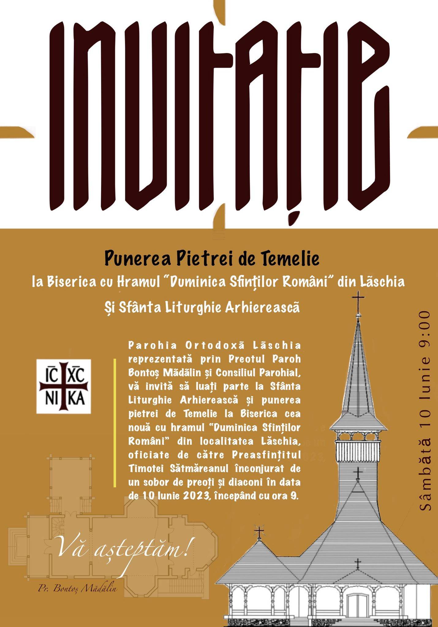 „Parohia Ortodoxă Lăschia, reprezentată prin preotul paroh Mădălin Bontoș și Consiliul Parohial, vă invită să luați parte la Sfânta Liturghie Arhierească și punerea pietrei de temelie, la biserica cea nouă, cu hramul „Duminica Sfinților Români” din localitatea Lăschia, oficiate de către Preasfințitul Timotei Sătmăreanul, înconjurat de un sobor de preoți și diaconi, în data de 10 iunie, începând cu ora 9”, arată oficialii parohiei ortodoxe.