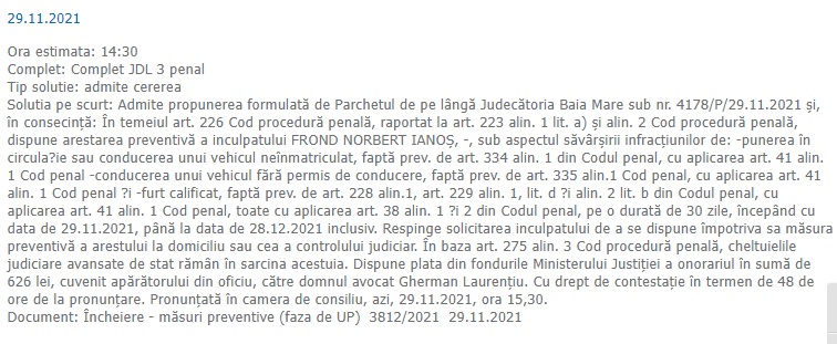 Așa cum era de așteptat, tânărul a fost arestat preventiv. „Solutia pe scurt: Admite propunerea formulată de Parchetul de pe lângă Judecătoria Baia Mare sub nr. 4178/P/29.11.2021 şi, în consecinţă: În temeiul art. 226 Cod procedură penală, raportat la art. 223 alin. 1 lit. a) şi alin. 2 Cod procedură penală, dispune arestarea preventivă a inculpatului FROND NORBERT IANOŞ, -, sub aspectul săvârşirii infracţiunilor de: -punerea în circula?ie sau conducerea unui vehicul neînmatriculat, faptă prev. de art. 334 alin. 1 din Codul penal, cu aplicarea art. 41 alin. 1 Cod penal -conducerea unui vehicul fără permis de conducere, faptă prev. de art. 335 alin.1 Cod penal, cu aplicarea art. 41 alin. 1 Cod penal ?i -furt calificat, faptă prev. de art. 228 alin.1, art. 229 alin. 1, lit. d ?i alin. 2 lit. b din Codul penal, cu aplicarea art. 41 alin. 1 Cod penal, toate cu aplicarea art. 38 alin. 1 ?i 2 din Codul penal, pe o durată de 30 zile, începând cu data de 29.11.2021, până la data de 28.12.2021 inclusiv. Respinge solicitarea inculpatului de a se dispune împotriva sa măsura preventivă a arestului la domiciliu sau cea a controlului judiciar. În baza art. 275 alin. 3 Cod procedură penală, cheltuielile judiciare avansate de stat rămân în sarcina acestuia. Dispune plata din fondurile Ministerului Justiţiei a onorariul în sumă de 626 lei, cuvenit apărătorului din oficiu, către domnul avocat Gherman Laurenţiu. Cu drept de contestaţie în termen de 48 de ore de la pronunţare. Pronunţată în camera de consiliu, azi, 29.11.2021, ora 15,30. Document: Încheiere – măsuri preventive (faza de UP) 3812/2021 29.11.2021”, se arată în soluția pe scurt.