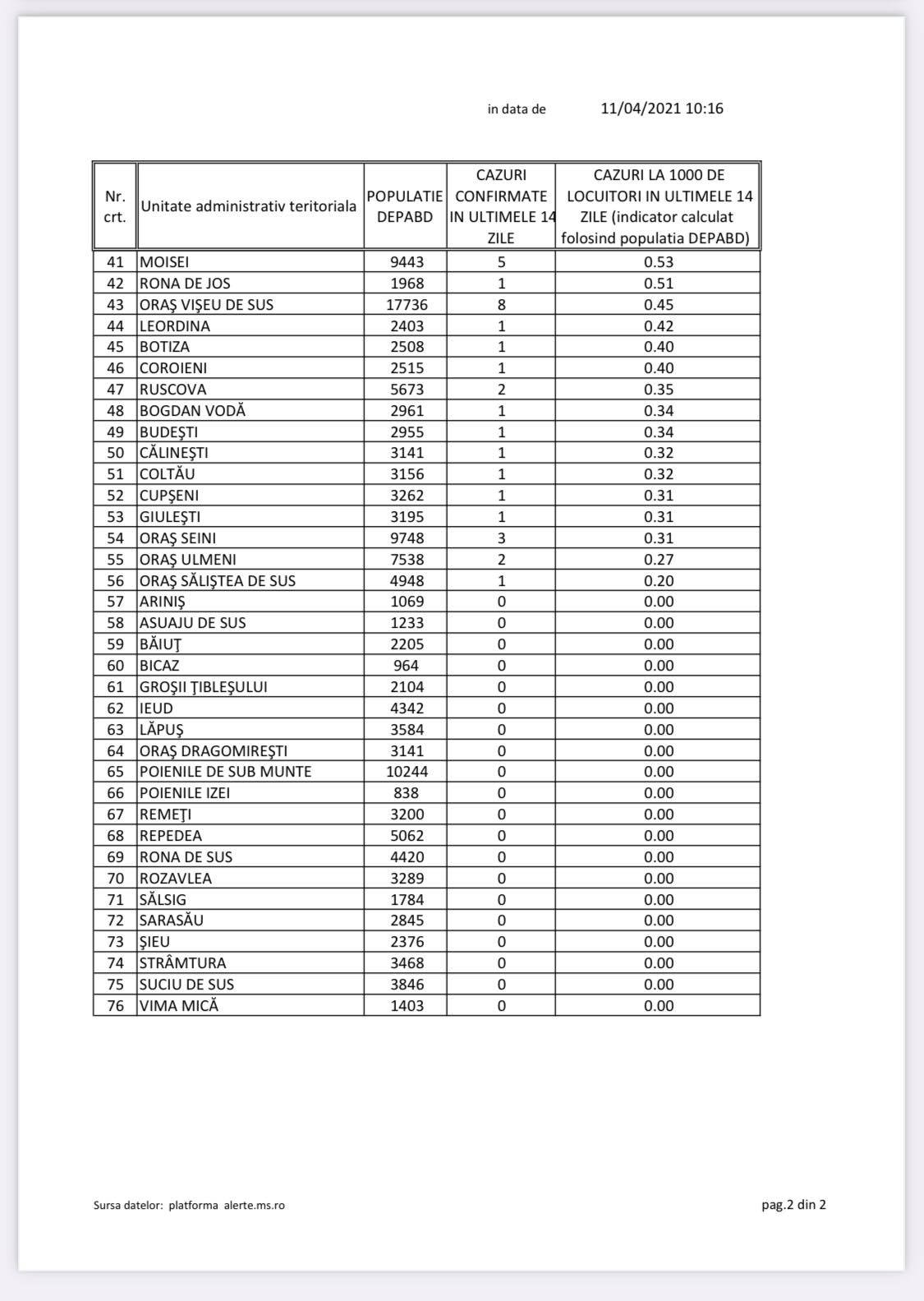 Așadar, avem două unități administrativ-teritoriale (UAT) cu o incidență mai mare de 3. Acest lucru înseamnă două UAT-uri în scenariul roșu. În prezent, avem 17 UAT-uri cu incidența de la 1,5 la 3 cazuri la mia de locuitori, considerate praguri de scenariu. Avem 20 UAT-uri în care nu s-a înregistrat niciun caz (sau nu a fost raportat) în ultimele două săptămâni. În prezent, nu avem localități carantinate zonal în Maramureș.