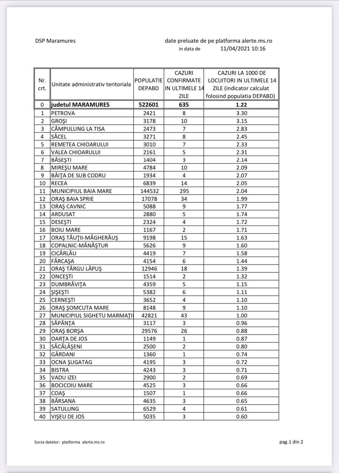 Astăzi, 11 aprilie, nu avem localități în carantină zonală în Maramureș. În ceea ce privește numărul de cazuri, municipiul Baia Mare se menține, logic, pe primul loc, întrucât are și cea mai mare populație.