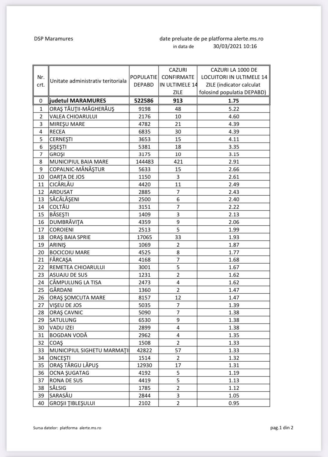 Așadar, avem o unitate administrativ-teritoriale (UAT) cu incidența de peste 5, patru UAT-uri cu o incidență mai mare de 4, dar sub 5 și încă două UAT-uri cu o incidență mai mare de 3, dar sub 4. Acest lucru înseamnă un total de șapte UAT-uri în care incidența este mai mare de pragul de 3 cazuri la mia de locuitori. Totodată, mai avem și 17 UAT-uri cu incidența de la 1,5 la 3 cazuri la mia de locuitori, considerate praguri de scenariu. Avem 18 UAT-uri în care nu s-a înregistrat niciun caz (sau nu a fost raportat) în ultimele două săptămâni. Ca atare, a crescut numărul cazurilor la nivel județean, în unele UAT-uri crescând incidența destul de mult. În prezent, avem mai multe localități carantinate zonal, respectiv UAT-urile Recea, Tăuții Măgherăuș și Coltău, ceea ce înseamnă atât localitățile menționate, cât și cele aparținătoare aferente. UAT Coltău iese din carantină zonală miercuri, 31 martie, la ora 19.00.