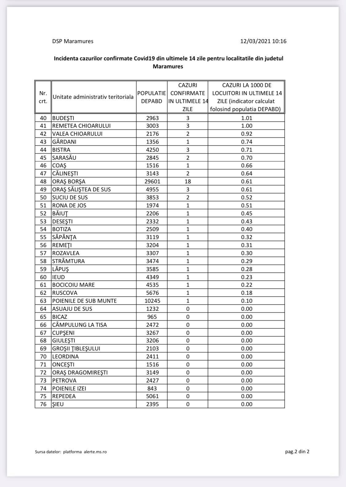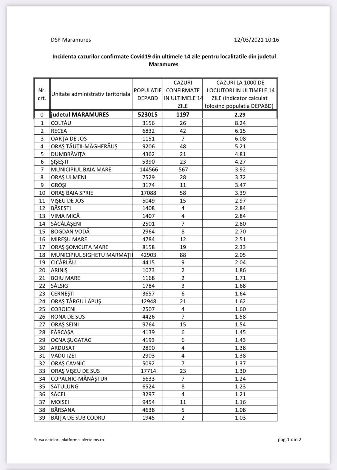 Astăzi, 12 martie, avem mai multe localități în carantină zonală, respectiv comunele Recea și Șișești, orașul Tăuții Măgherăuș, localitatea Arduzel, sat aparținător orașului Ulmeni și comuna Coltău. În ceea ce privește numărul de cazuri, municipiul Baia Mare se menține, logic, pe primul loc, întrucât are și cea mai mare populație.