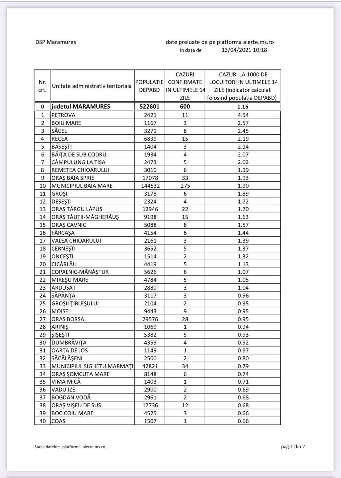 Rata de infectare: Baia Mare, incidența 1,90! Petrova, singura cu incidența mai mare de 3! 19 UAT-uri sunt fără cazuri de COVID-19. Vezi situația pe localități