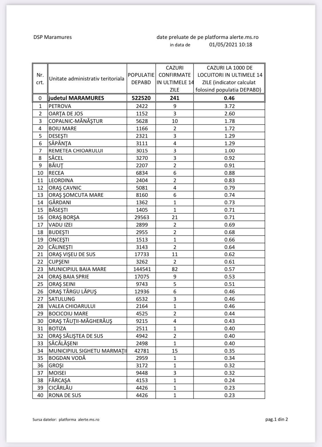 Astăzi, 1 mai, nu avem UAT-uri în carantină zonală în Maramureș. În ceea ce privește numărul de cazuri, municipiul Baia Mare se menține, logic, pe primul loc, întrucât are și cea mai mare populație.