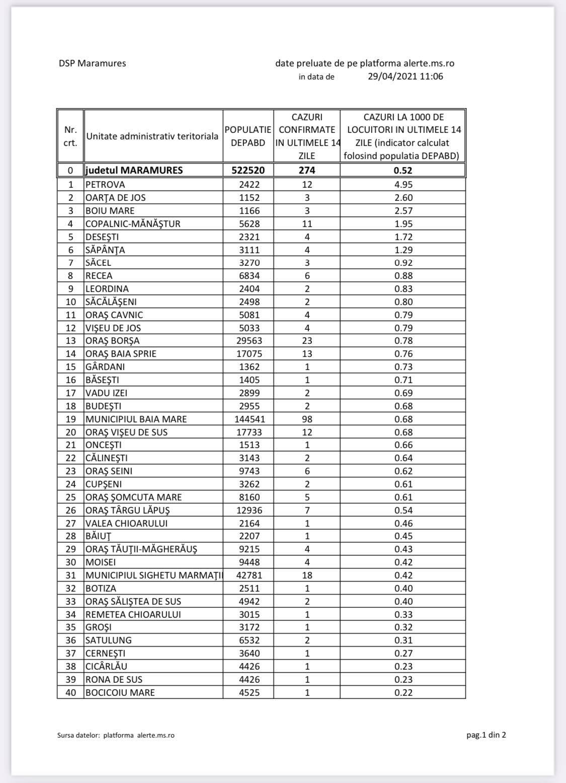 Astăzi, 29 aprilie, nu avem UAT-uri în carantină zonală în Maramureș. În ceea ce privește numărul de cazuri, municipiul Baia Mare se menține, logic, pe primul loc, întrucât are și cea mai mare populație.
