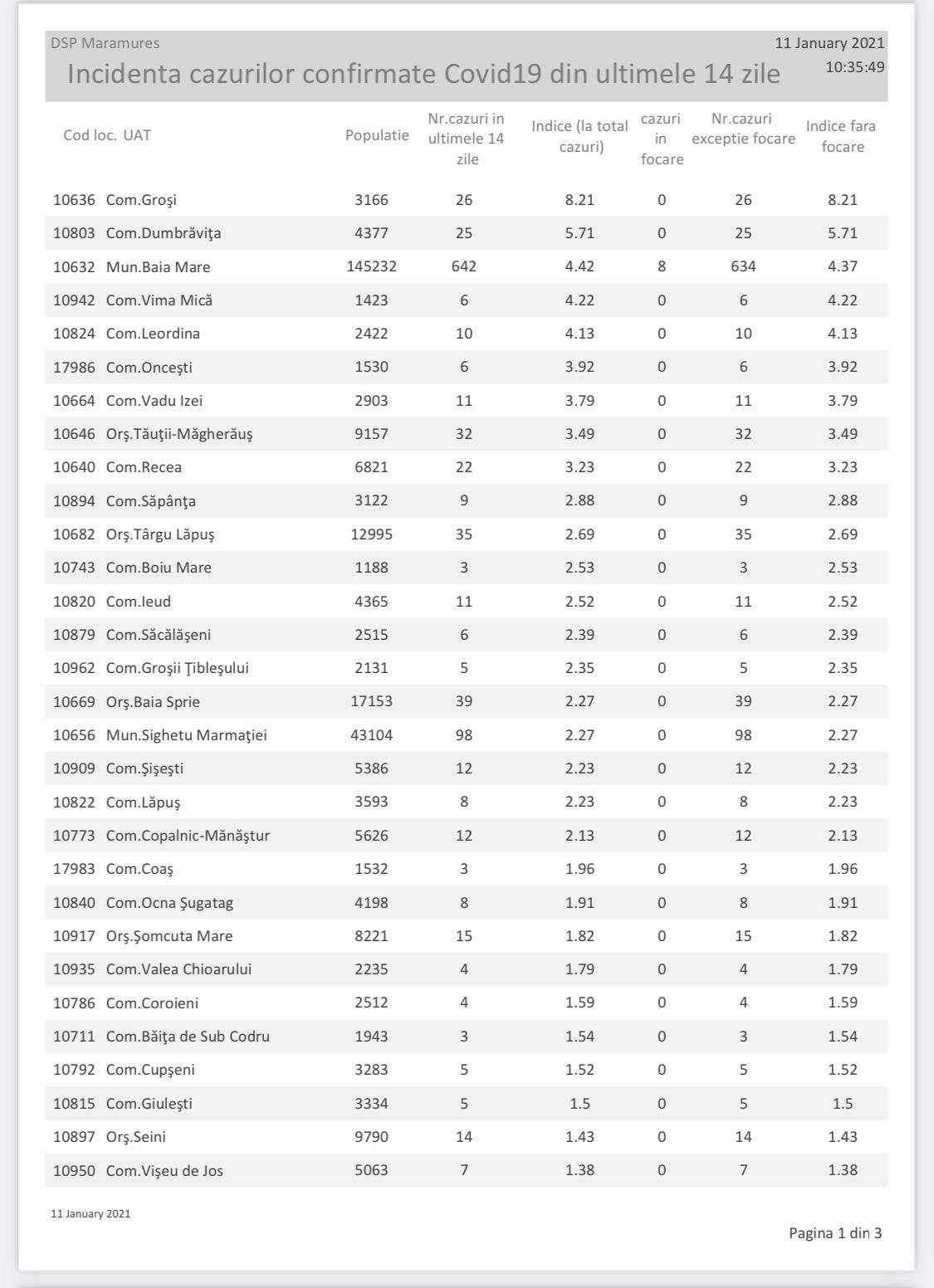 Referitor la incidența cazurilor la mia de locuitori, vorbim despre reședința de județ a Maramureșului și alte patru comune pe primele cinci locuri ale clasamentului. Acestea sunt, în ordine, comunele Groși și Dumbrăvița, respectiv municipiul Baia Mare, care închide podiumul. Vin, apoi, Vima Mică și Leordina. După top 5, vin comunele Oncești și Vadu Izei, orașul Tăuții Măgherăuș și comuna Recea cu incidența peste 3 cazuri la mia de locuitori, după care vine Săpânța. Ca o paranteză, Baia Mare, avea, în 7 ianuarie, incidența de 3,37, iar după patru zile a ajuns la 4,37.