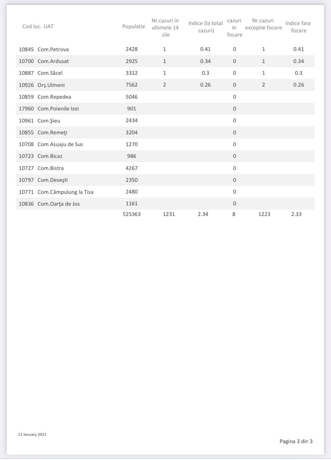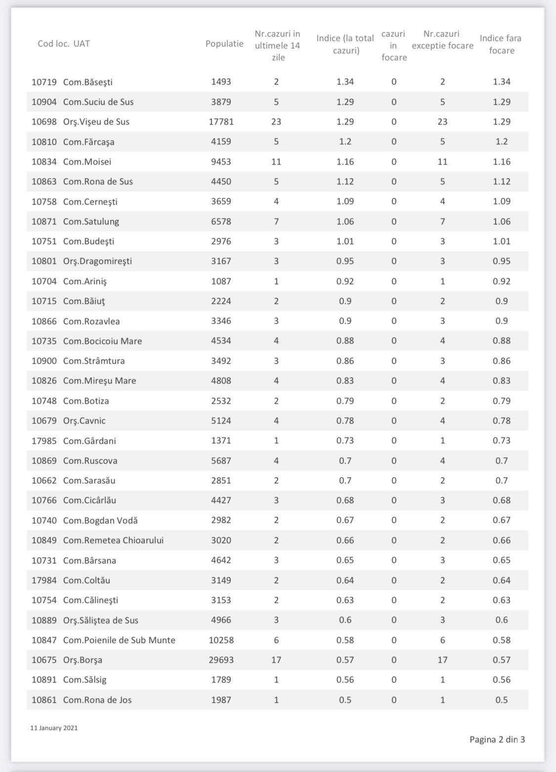 Așadar, avem o singură unitate administrativ-teritorială cu incidența de peste 8 cazuri la mia de locuitori, una cu incidența peste 5, dar sub 8, încă trei cu incidența peste 4, dar sub 5 și încă patru cu incidența de peste 3, dar sub 4. Acest lucru înseamnă nouă UAT-uri (inclusiv Baia Mare) cu incidența peste 3 cazuri la mia de locuitori. Mai avem 19 UAT-uri cu incidența de la 1,5 la 3 cazuri la mia de locuitori, considerate praguri de scenariu. Avem și zece UAT-uri în care nu s-a înregistrat niciun caz (sau nu a fost raportat) în ultimele două săptămâni.