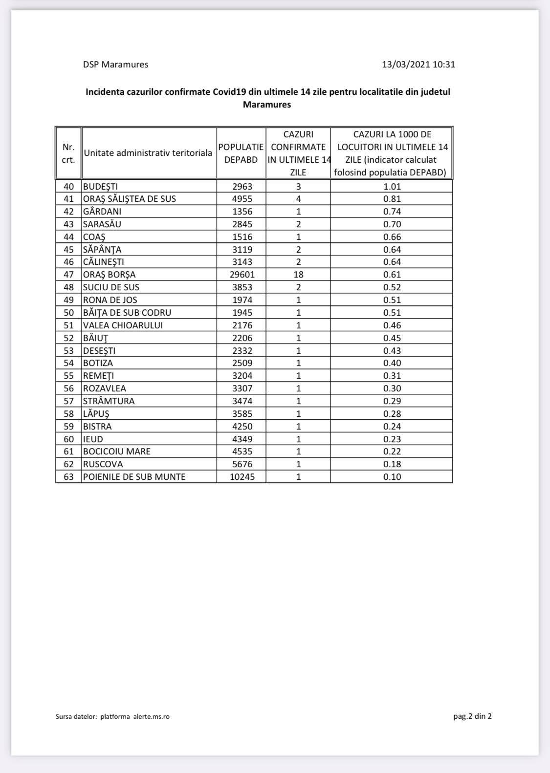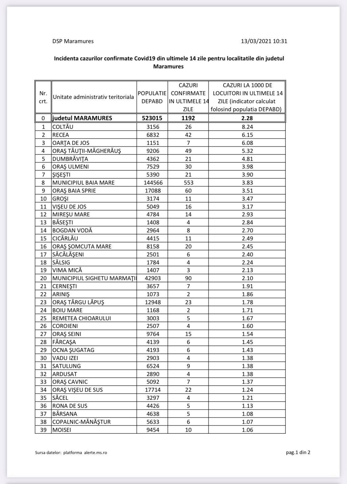 Astăzi, 13 martie, avem mai multe localități în carantină zonală, respectiv comunele Recea și Șișești, orașul Tăuții Măgherăuș, localitatea Arduzel, sat aparținător orașului Ulmeni și comuna Coltău. În ceea ce privește numărul de cazuri, municipiul Baia Mare se menține, logic, pe primul loc, întrucât are și cea mai mare populație.