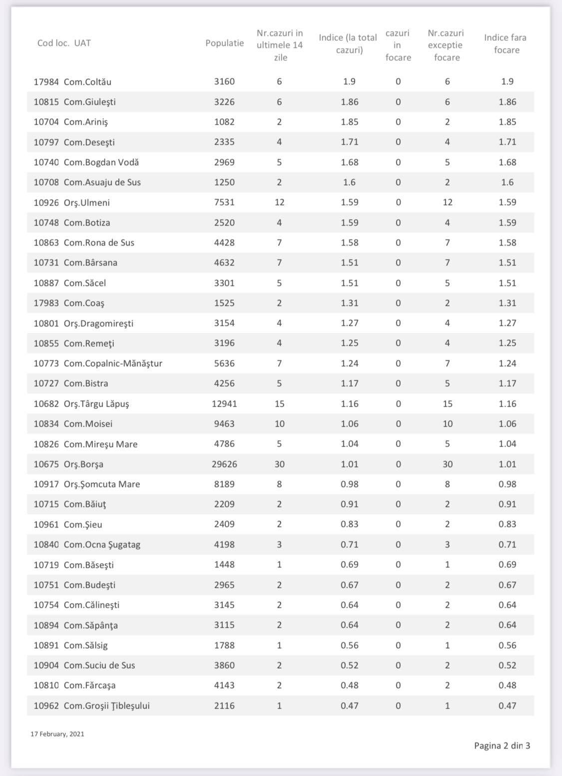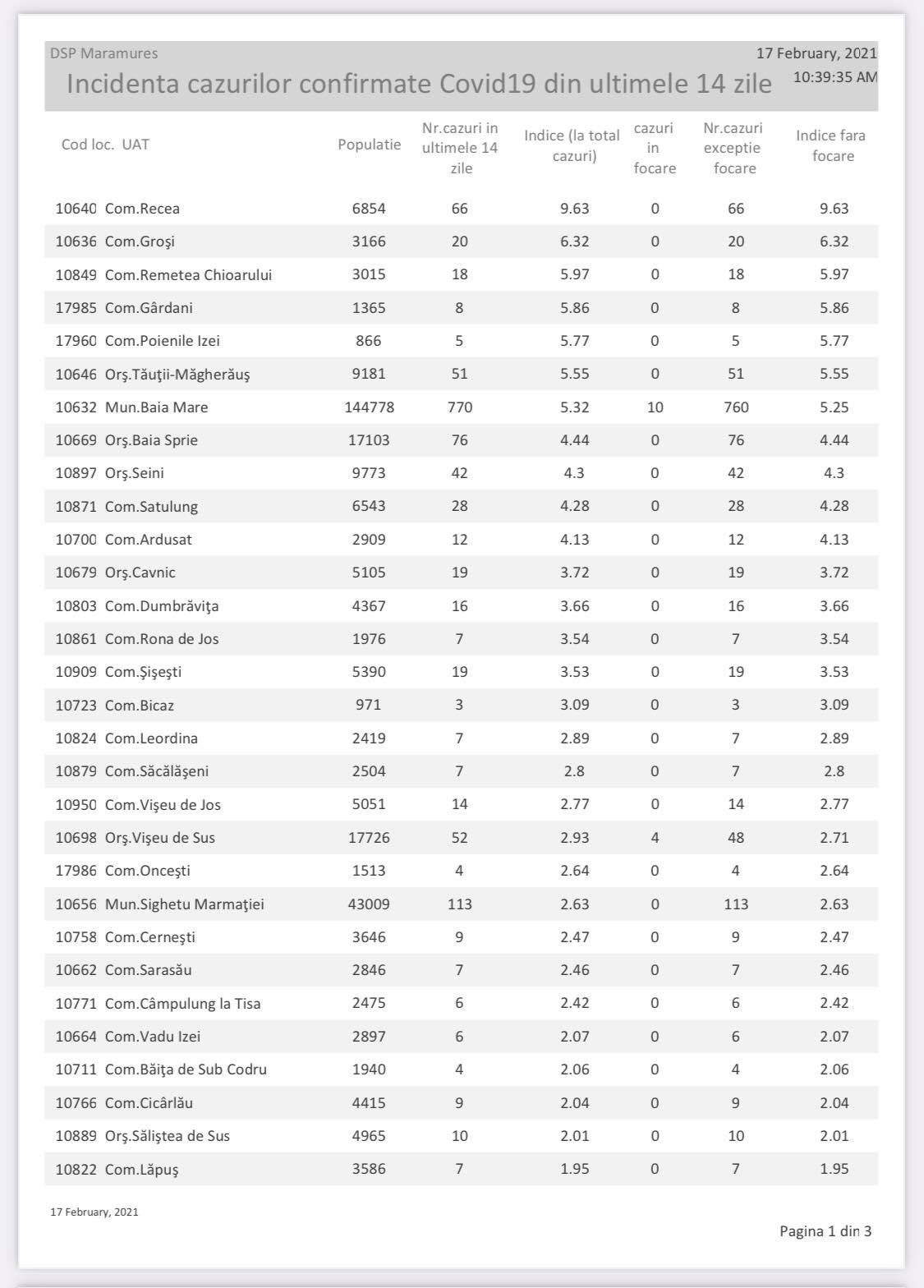 Așadar, avem o unitate administrativ-teritorială (UAT) cu incidența de peste 9, o UAT cu o incidență mai mare de 6, dar sub 7, cinci UAT-uri cu o incidență mai mare de 5, dar sub 6, patru UAT-uri cu o incidență mai mare de 4, dar sub 5 și încă cinci UAT-uri cu o incidență mai mare de 3, dar sub 4. Acest lucru înseamnă un total de 16 UAT-uri în care incidența este mai mare de pragul de 3 cazuri la mia de locuitori. Totodată, mai avem și 25 UAT-uri cu incidența de la 1,5 la 3 cazuri la mia de locuitori, considerate praguri de scenariu. Avem numai cinci UAT-uri în care nu s-a înregistrat niciun caz (sau nu a fost raportat) în ultimele două săptămâni, respectiv Petrova, Oarța de Jos, Coroieni, Vima Mică și Boiu Mare. Ca atare, a crescut numărul cazurilor la nivel județean, în unele UAT-uri crescând incidența destul de mult. În prezent, avem mai multe localități carantinate zonal, respectiv comunele Poienile Izei și Gârdani, orașul Seini, întreaga comună Recea și localitatea Remetea Chioarului.