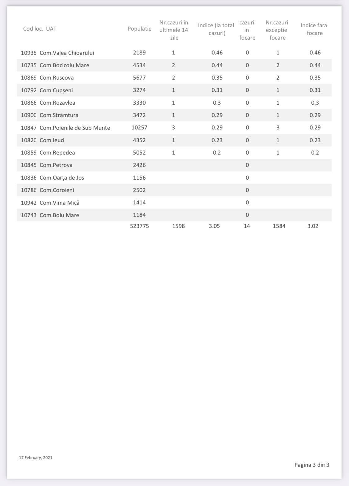 Numărul cazurilor de COVID-19 în Maramureș a înregistrat o mică creștere față de raportarea de ieri. Iată cifrele aferente zilei de 17 februarie, cele mai recente publicate de DSP Maramureș! În total, în ultimele două săptămâni, s-au înregistrat 1.598 cazuri de COVID-19 în județ, din care 14 în focare, în Baia Mare și Vișeu de Sus și 1.584 în afara focarelor. Asta înseamnă o incidență de 3,02 fără focare și 3,05 cu focare, însă cea fără focare este cea luată momentan în considerare. Astăzi, 17 februarie, avem mai multe localități în carantină zonală, respectiv comunele Poienile Izei și Gârdani, orașul Seini, întreaga comună Recea și localitatea Remetea Chioarului.