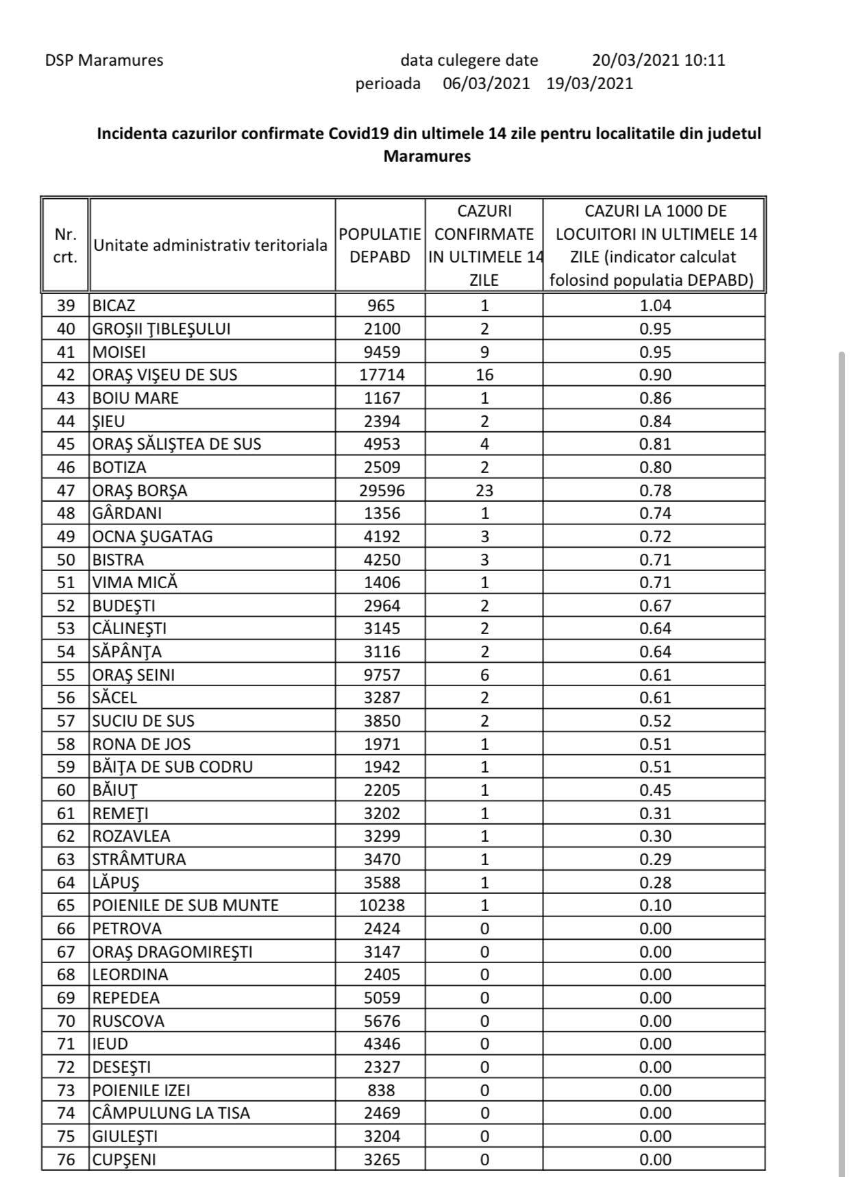 Așadar, avem o unitate administrativ-teritoriale (UAT) cu incidența de peste 6, două UAT-uri cu o incidență mai mare de 5, dar sub 6, o UAT cu o incidență mai mare de 4, dar sub 5 și încă nouă UAT-uri cu o incidență mai mare de 3, dar sub 4. Acest lucru înseamnă un total de 13 UAT-uri în care incidența este mai mare de pragul de 3 cazuri la mia de locuitori. Totodată, mai avem și 19 UAT-uri cu incidența de la 1,5 la 3 cazuri la mia de locuitori, considerate praguri de scenariu. Avem 11 UAT-uri în care nu s-a înregistrat niciun caz (sau nu a fost raportat) în ultimele două săptămâni. Ca atare, a crescut numărul cazurilor la nivel județean, în unele UAT-uri crescând incidența destul de mult. În prezent, avem mai multe localități carantinate zonal, respectiv UAT-urile Recea, Tăuții Măgherăuș și Coltău, ceea ce înseamnă atât localitățile menționate, cât și cele aparținătoare aferente. Localitatea Arduzel, sat aparținător orașului Ulmeni, iese astăzi, sâmbătă, 20 martie, din carantina zonală.