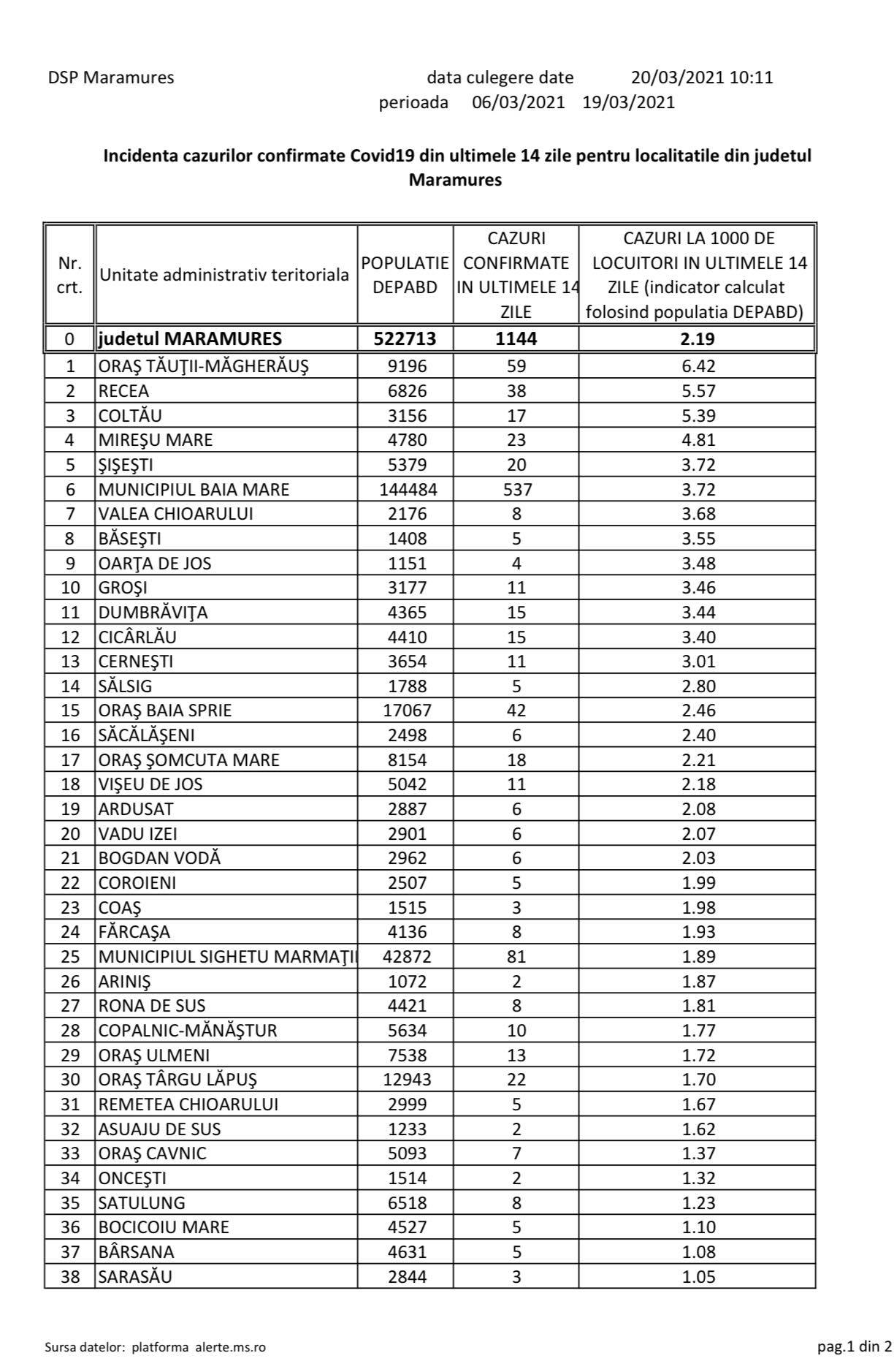 Așadar, avem o unitate administrativ-teritoriale (UAT) cu incidența de peste 6, două UAT-uri cu o incidență mai mare de 5, dar sub 6, o UAT cu o incidență mai mare de 4, dar sub 5 și încă nouă UAT-uri cu o incidență mai mare de 3, dar sub 4. Acest lucru înseamnă un total de 13 UAT-uri în care incidența este mai mare de pragul de 3 cazuri la mia de locuitori. Totodată, mai avem și 19 UAT-uri cu incidența de la 1,5 la 3 cazuri la mia de locuitori, considerate praguri de scenariu. Avem 11 UAT-uri în care nu s-a înregistrat niciun caz (sau nu a fost raportat) în ultimele două săptămâni. Ca atare, a crescut numărul cazurilor la nivel județean, în unele UAT-uri crescând incidența destul de mult. În prezent, avem mai multe localități carantinate zonal, respectiv UAT-urile Recea, Tăuții Măgherăuș și Coltău, ceea ce înseamnă atât localitățile menționate, cât și cele aparținătoare aferente. Localitatea Arduzel, sat aparținător orașului Ulmeni, iese astăzi, sâmbătă, 20 martie, din carantina zonală.