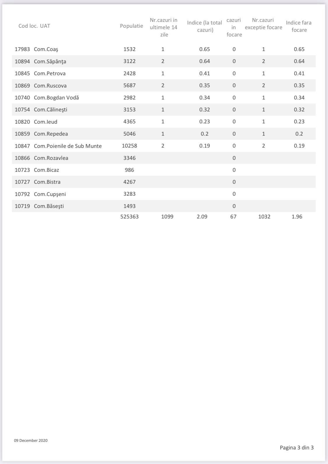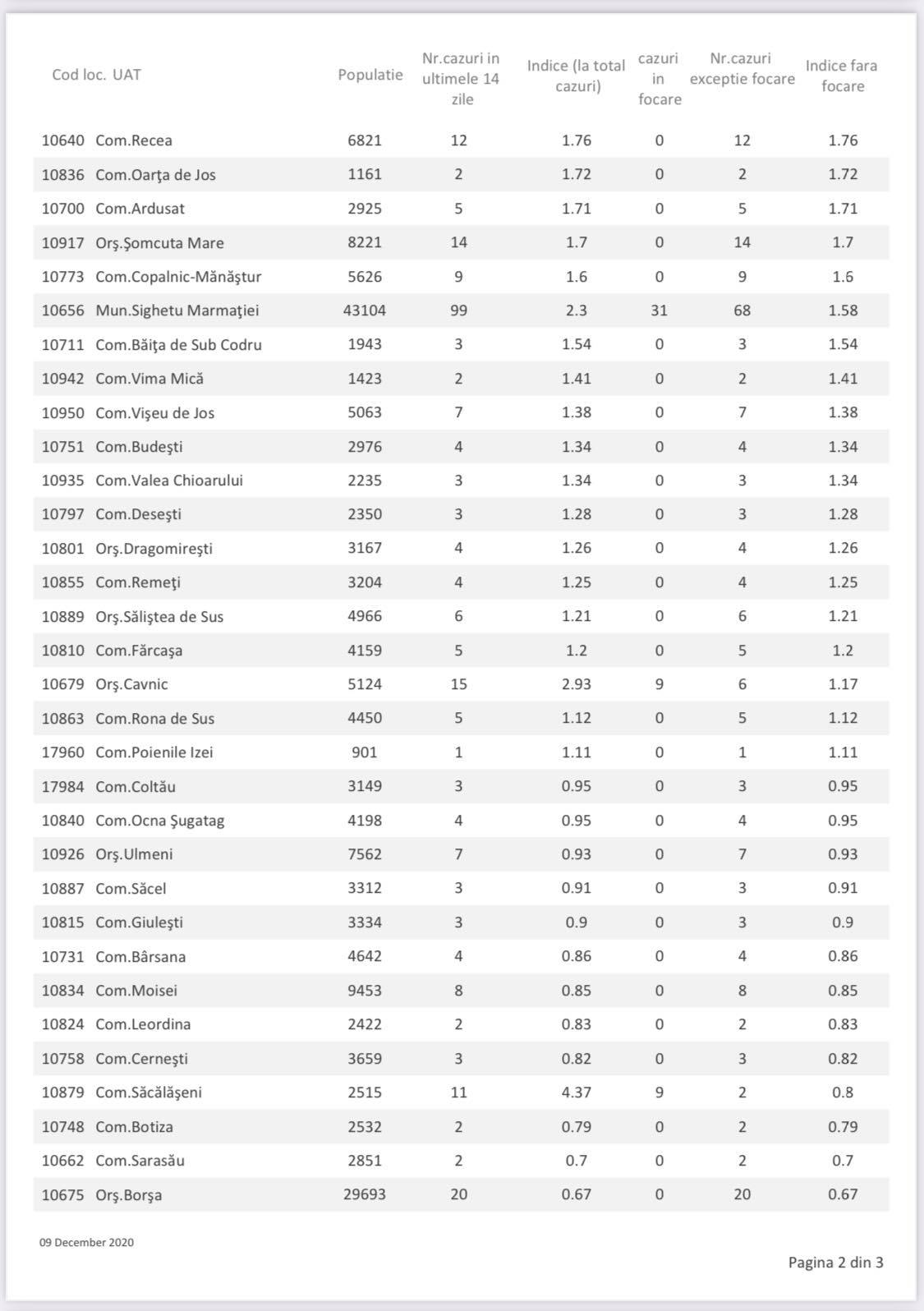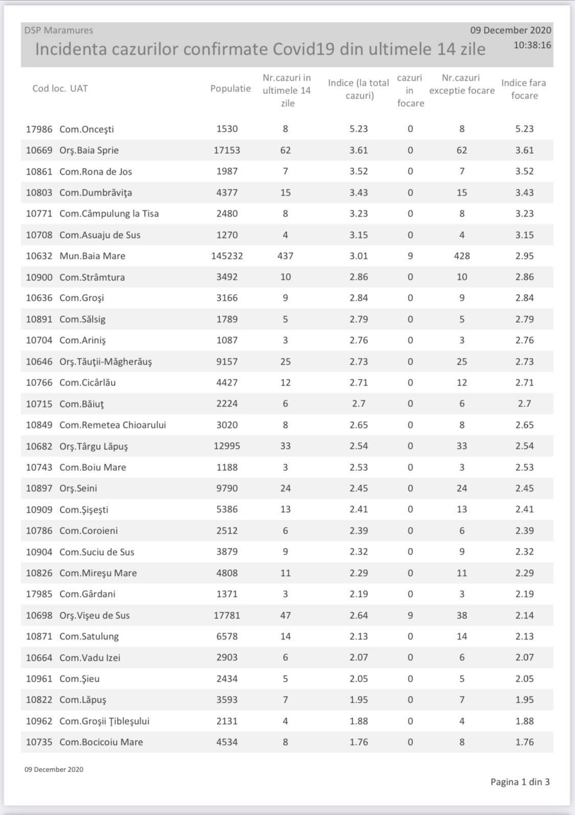 Concret, în ultimele două săptămâni, s-au înregistrat 1.099 cazuri în județ, din care 1.032 în afara focarelor și 67 în focare. Asta înseamnă o incidență de 2,09 cazuri la mia de locuitori cu tot cu focare și de 1,96 fără focare, la nivelul statisticii aferente zilei de 9 decembrie. Cele mai multe cazuri s-au înregistrat, în ultimele două săptămâni, în Baia Mare (437), Sighetu Marmației (99), Baia-Sprie (62), Vișeu de Sus (47) și Târgu Lăpuș (33).