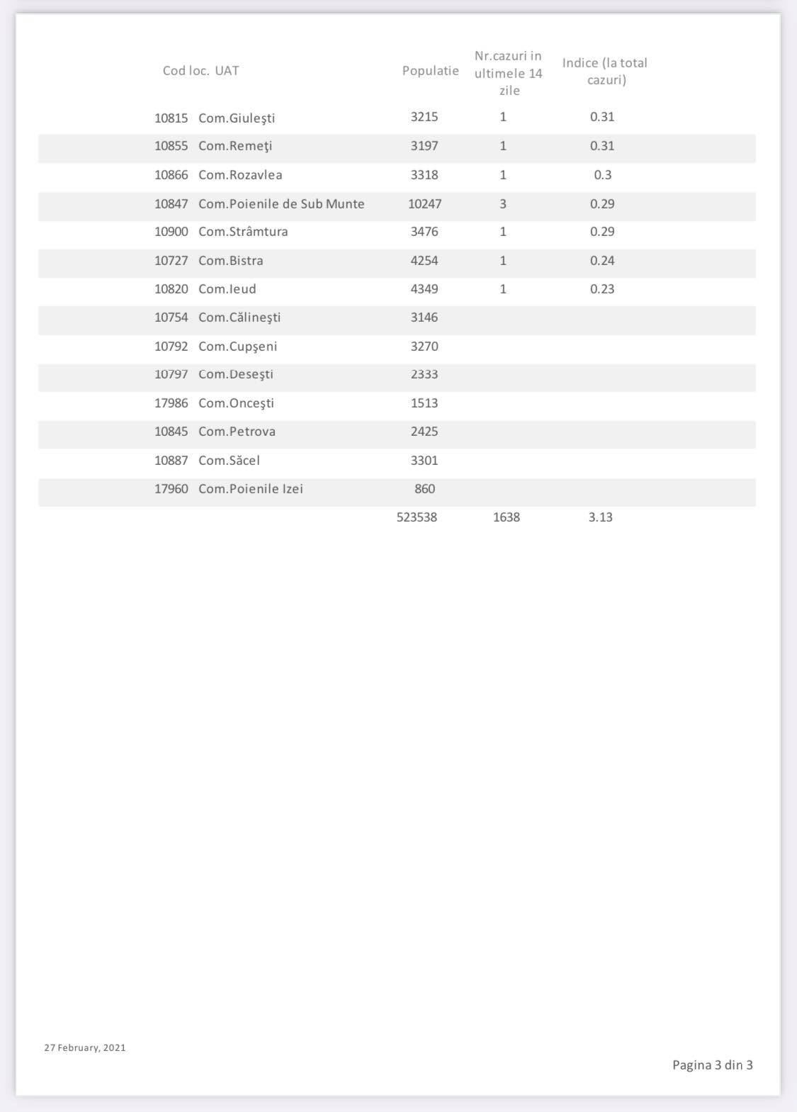 Așadar, avem o unitate administrativ-teritorială (UAT) cu incidența de peste 11, două UAT-uri cu o incidență mai mare de 6, dar sub 7, trei UAT-uri cu o incidență mai mare de 5, dar sub 6, trei UAT-uri cu o incidență mai mare de 4, dar sub 5 și încă două UAT-uri cu o incidență mai mare de 3, dar sub 4. Acest lucru înseamnă un total de 11 UAT-uri în care incidența este mai mare de pragul de 3 cazuri la mia de locuitori. Totodată, mai avem și 24 UAT-uri cu incidența de la 1,5 la 3 cazuri la mia de locuitori, considerate praguri de scenariu. Avem numai șapte UAT-uri în care nu s-a înregistrat niciun caz (sau nu a fost raportat) în ultimele două săptămâni, respectiv Călinești, Cupșeni, Desești, Oncești, Petrova, Săcel și Poienile Izei. Ca atare, a crescut numărul cazurilor la nivel județean, în unele UAT-uri crescând incidența destul de mult. În prezent, avem mai multe localități carantinate zonal, respectiv comunele Gârdani, Recea, Remetea Chioarului, Groși, Rona de Jos, Șișești și orașul Tăuții Măgherăuș, cu localitățile aferente.