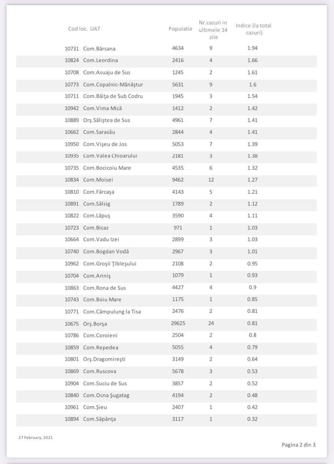Așadar, avem o unitate administrativ-teritorială (UAT) cu incidența de peste 11, două UAT-uri cu o incidență mai mare de 6, dar sub 7, trei UAT-uri cu o incidență mai mare de 5, dar sub 6, trei UAT-uri cu o incidență mai mare de 4, dar sub 5 și încă două UAT-uri cu o incidență mai mare de 3, dar sub 4. Acest lucru înseamnă un total de 11 UAT-uri în care incidența este mai mare de pragul de 3 cazuri la mia de locuitori. Totodată, mai avem și 24 UAT-uri cu incidența de la 1,5 la 3 cazuri la mia de locuitori, considerate praguri de scenariu. Avem numai șapte UAT-uri în care nu s-a înregistrat niciun caz (sau nu a fost raportat) în ultimele două săptămâni, respectiv Călinești, Cupșeni, Desești, Oncești, Petrova, Săcel și Poienile Izei. Ca atare, a crescut numărul cazurilor la nivel județean, în unele UAT-uri crescând incidența destul de mult. În prezent, avem mai multe localități carantinate zonal, respectiv comunele Gârdani, Recea, Remetea Chioarului, Groși, Rona de Jos, Șișești și orașul Tăuții Măgherăuș, cu localitățile aferente.