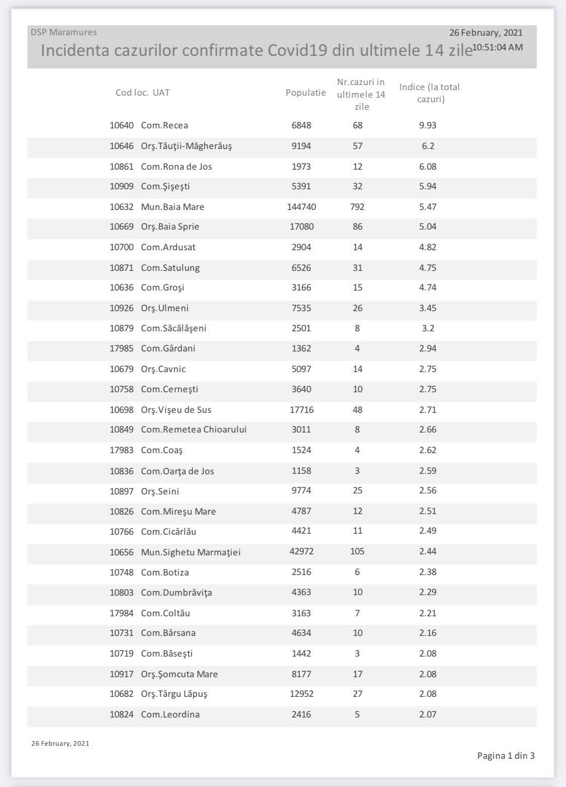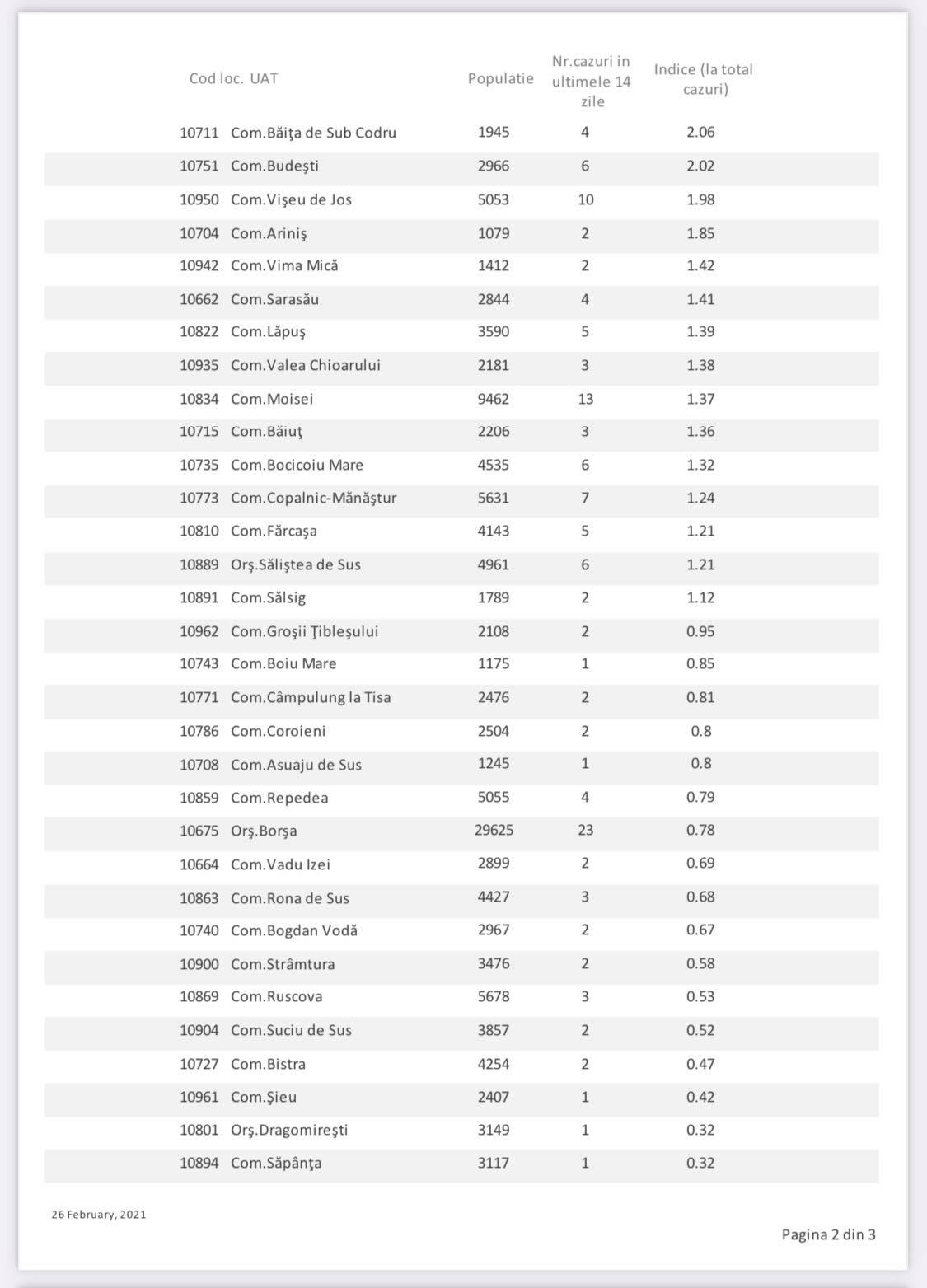 Așadar, avem o unitate administrativ-teritorială (UAT) cu incidența de peste 9, două UAT-uri cu o incidență mai mare de 6, dar sub 7, trei UAT-uri cu o incidență mai mare de 5, dar sub 6, trei UAT-uri cu o incidență mai mare de 4, dar sub 5 și încă două UAT-uri cu o incidență mai mare de 3, dar sub 4. Acest lucru înseamnă un total de 11 UAT-uri în care incidența este mai mare de pragul de 3 cazuri la mia de locuitori. Totodată, mai avem și 23 UAT-uri cu incidența de la 1,5 la 3 cazuri la mia de locuitori, considerate praguri de scenariu. Avem numai șapte UAT-uri în care nu s-a înregistrat niciun caz (sau nu a fost raportat) în ultimele două săptămâni, respectiv Bicaz, Cupșeni, Desești, Oncești, Petrova, Săcel și Poienile Izei. Ca atare, a crescut numărul cazurilor la nivel județean, în unele UAT-uri crescând incidența destul de mult. În prezent, avem mai multe localități carantinate zonal, respectiv comunele Gârdani, Recea, Remetea Chioarului, Groși, Rona de Jos, Șișești și orașul Tăuții Măgherăuș, cu localitățile aferente.